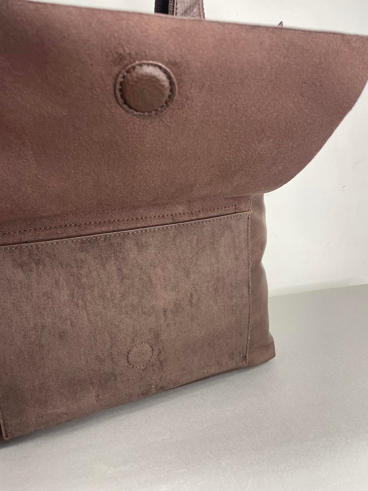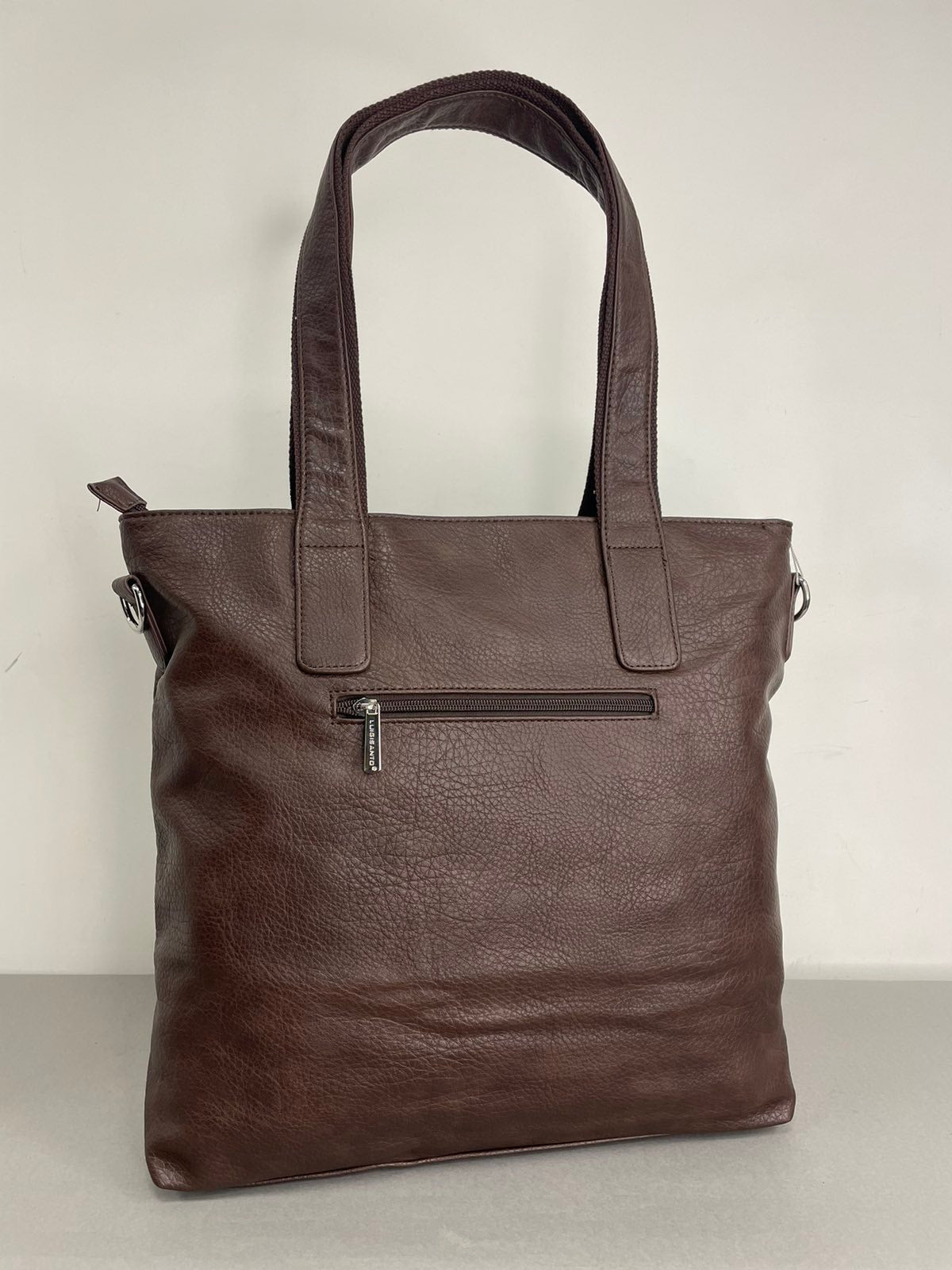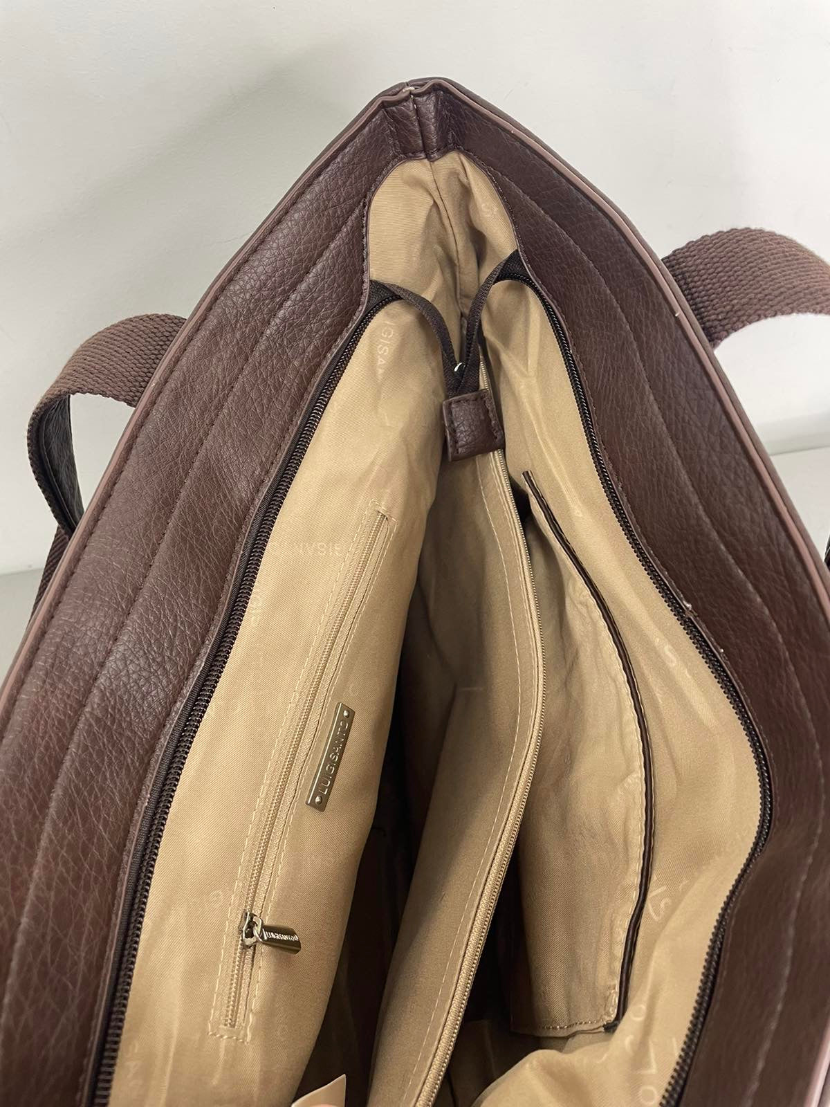 Moteriška Luigisanto rankinė, rudos spalvos, talpaus modelio. Rankinės viduje yra du skyriai, turi prisegamą reguliuojamo ilgio rankeną.