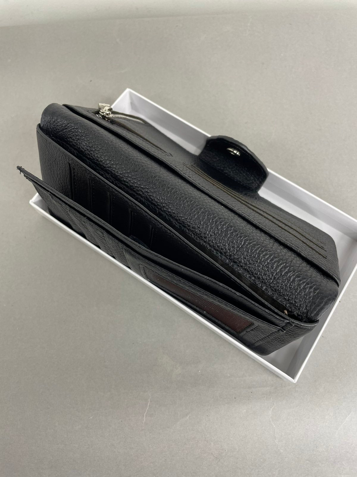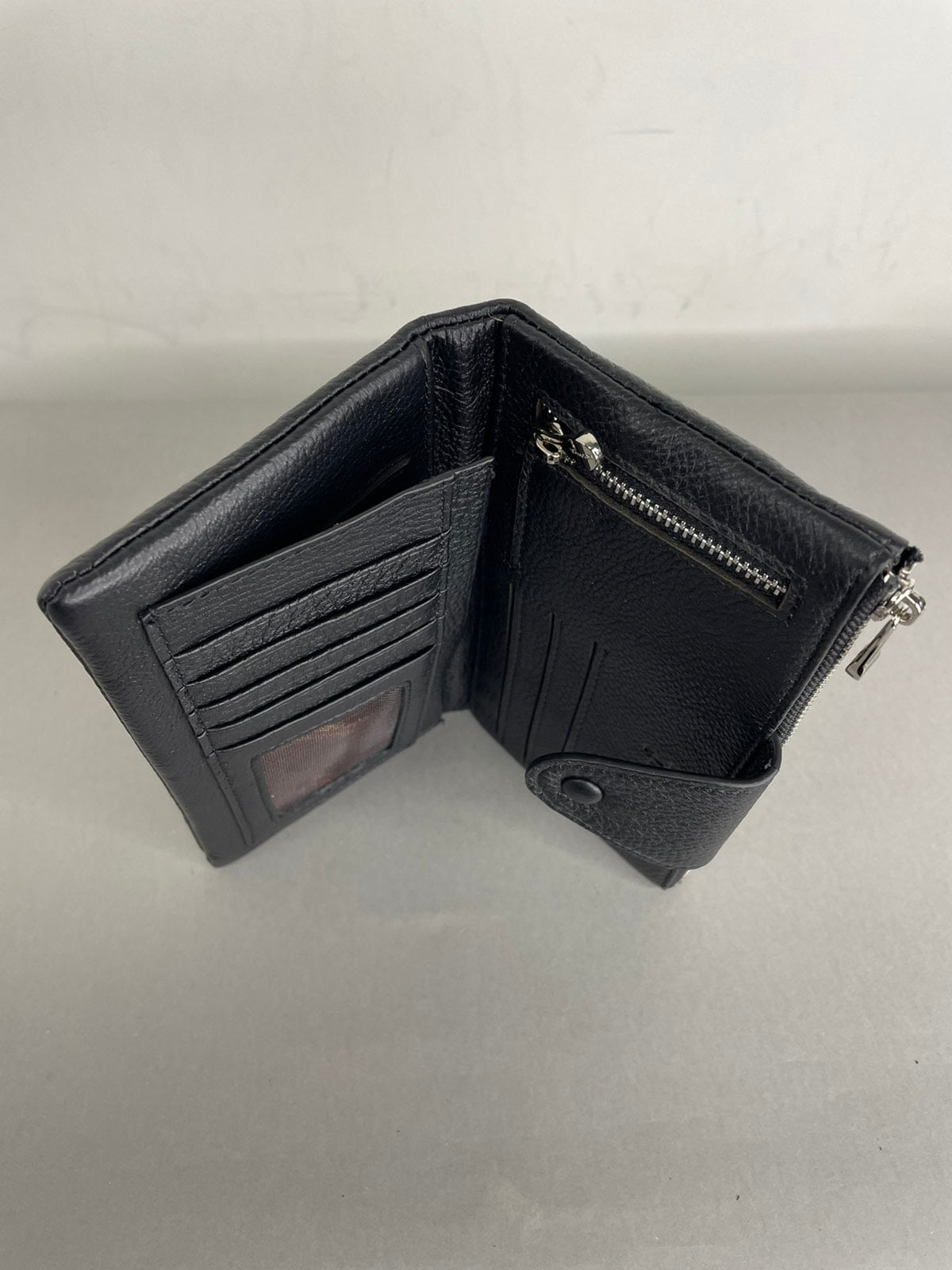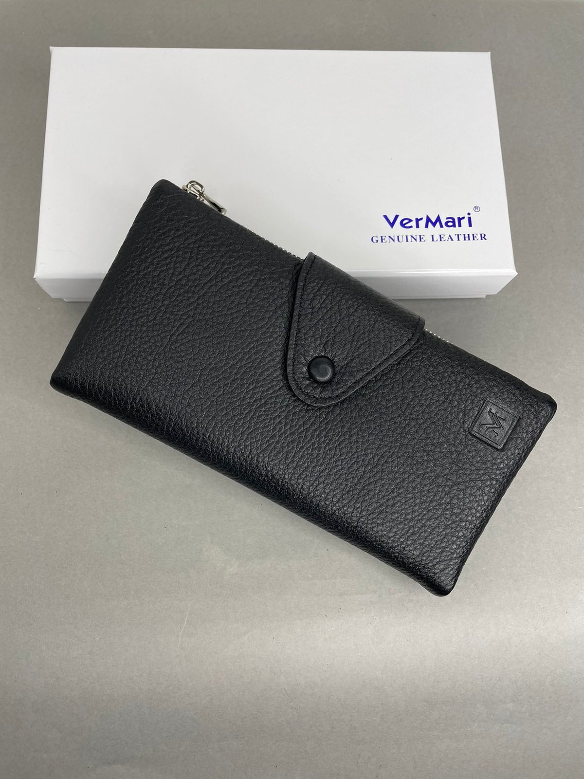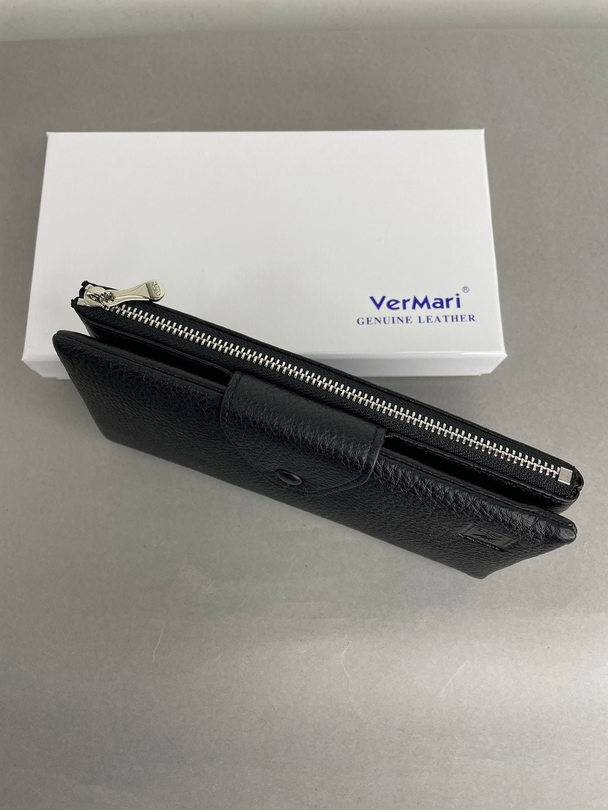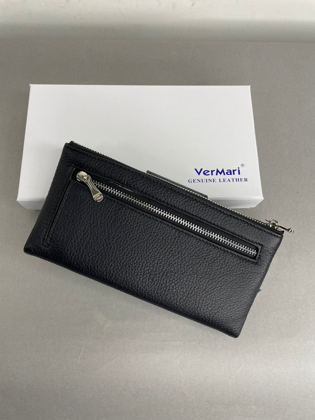 Natūralios odos, juodos spalvos moteriška VerMari piniginė. Piniginės viduje yra 13 skyrelių kortelėms bei dvi užtrauktuku užsegamos kišenėles. VerMari piniginės moterims pasižymi itin minkšta, malonia laikyti rankoje oda bei kokybe.