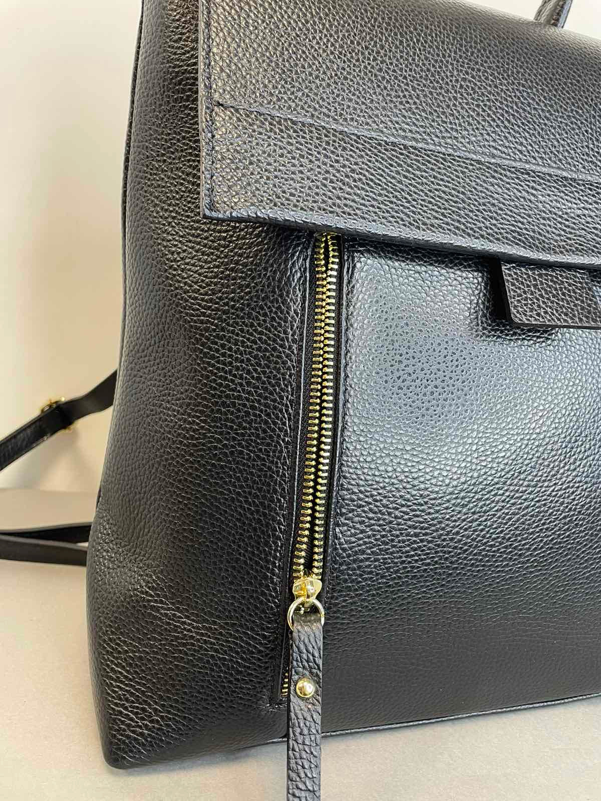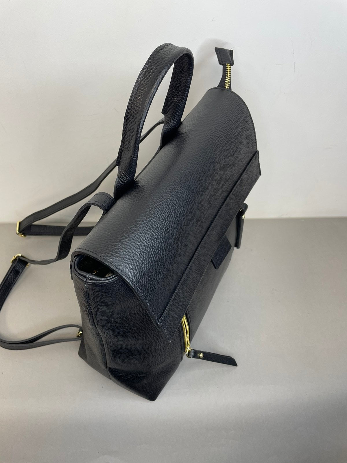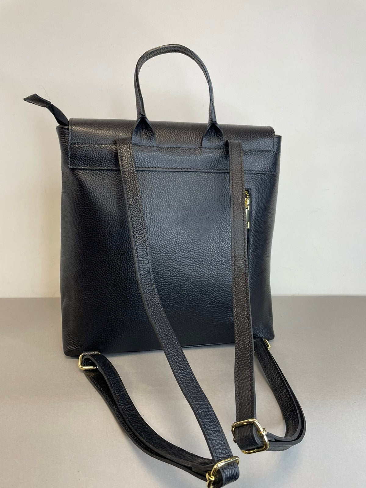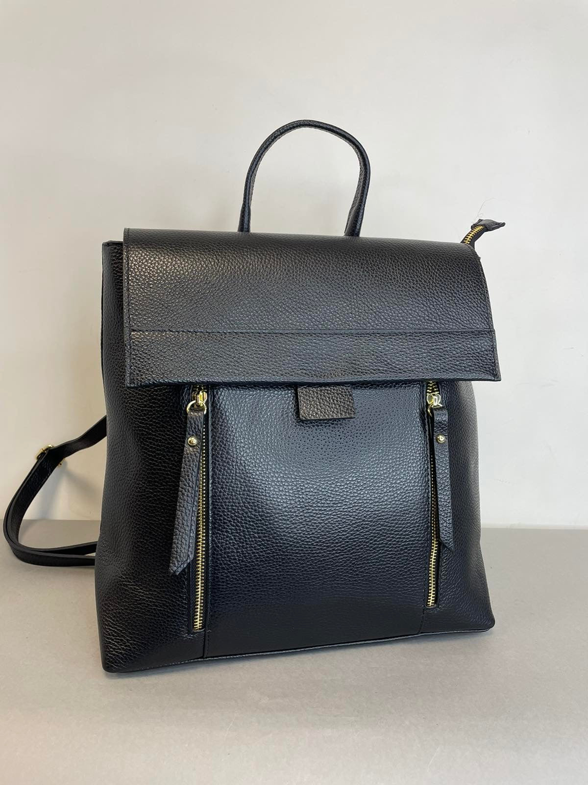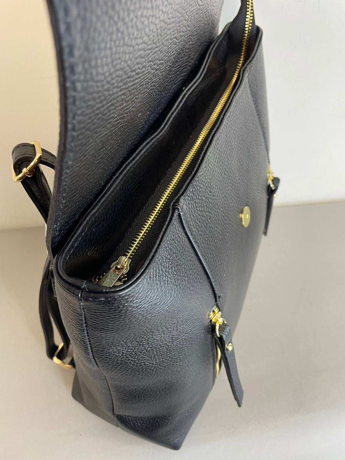 Stilinga natūralios odos moteriška kuprinė. Kuprinė nuodos spalvos su auksinės spalvos detalėmis, kuprinės užmetimas pritvirtinamas magnetu. Itališkos odinės kuprinės pasižymi aukšta kokybe ir stilingu dizainu.