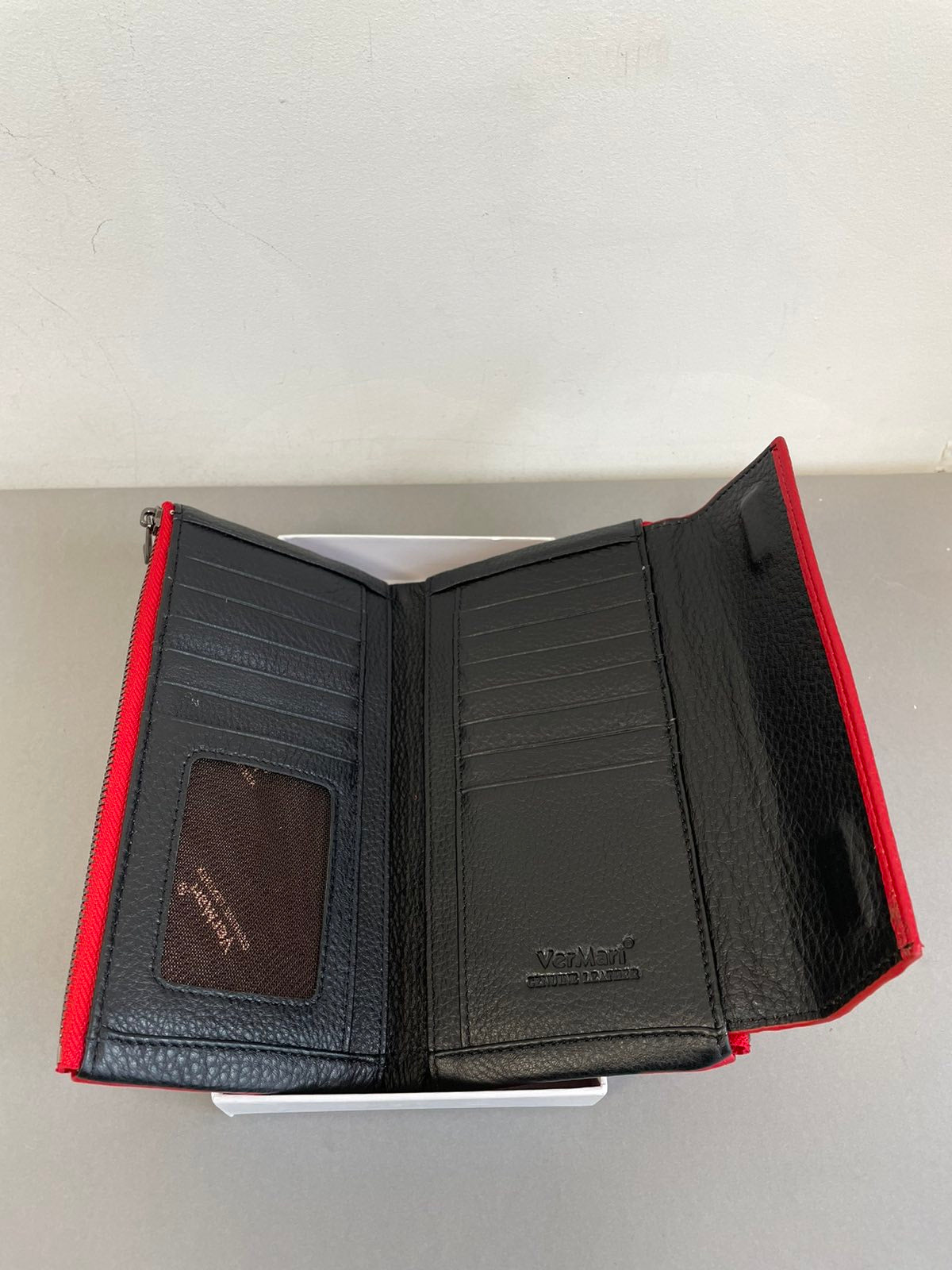 Patogi ir kokybiška, natūralios odos VerMari moteriška piniginė. Piniginės užmetimas pritvirtinamas megnetu, plačiai ir patogiai atsidarantis vidus talpina 13 kortelių, bei turi du užtrauktuku užsegamus skyrelius.
