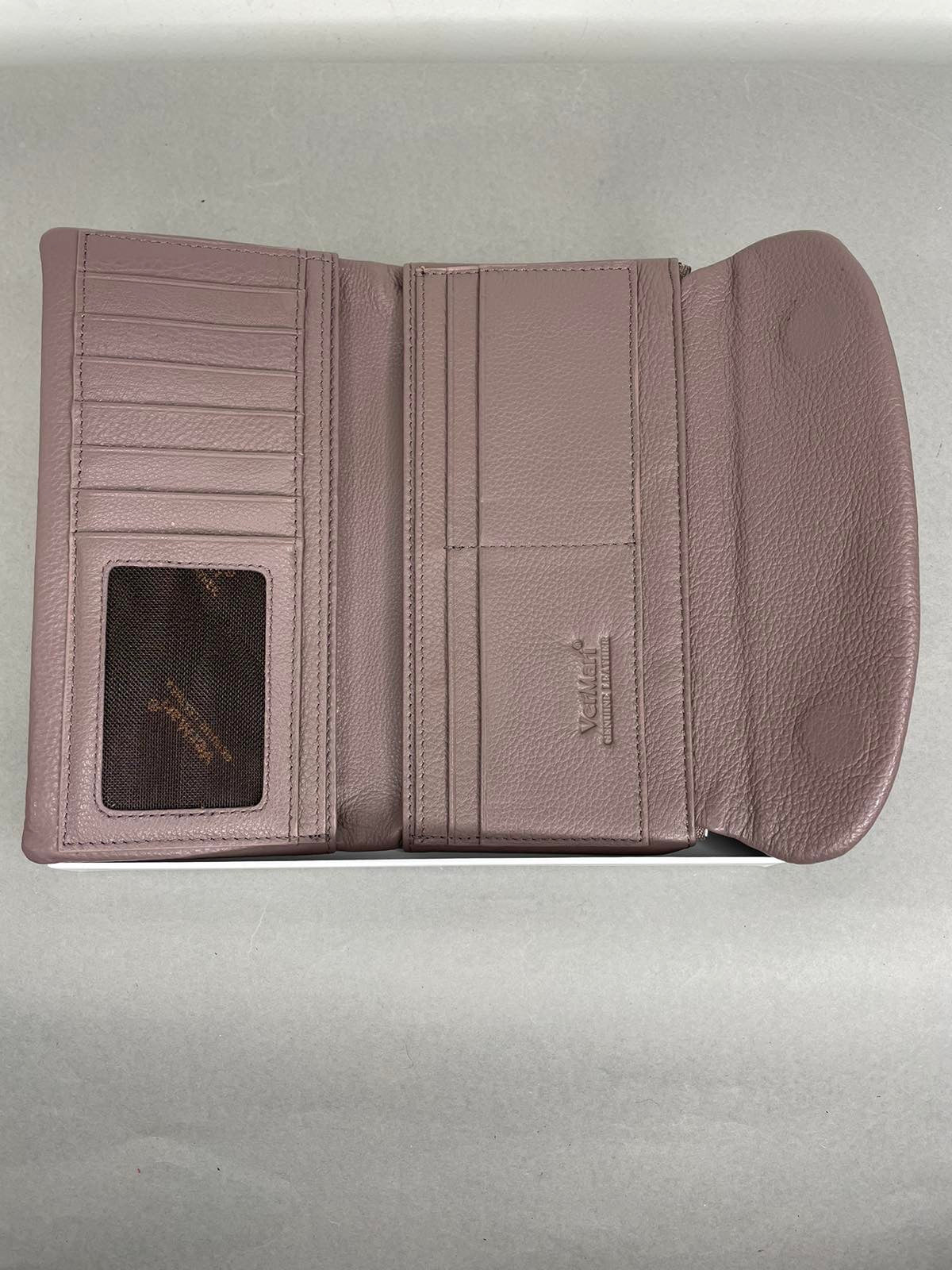 Patogi ir kokybiška natūralios odos moteriška piniginė. Piniginės užmetimas pritvirtinamas megnetu, piniginė talpina 11 kortelių ir turi vieną užtrauktuku užsegamą skyrelį.