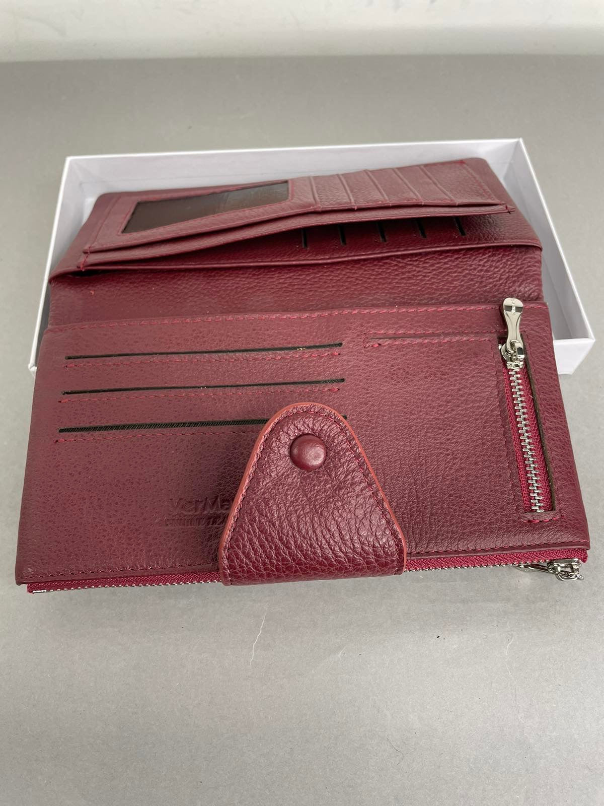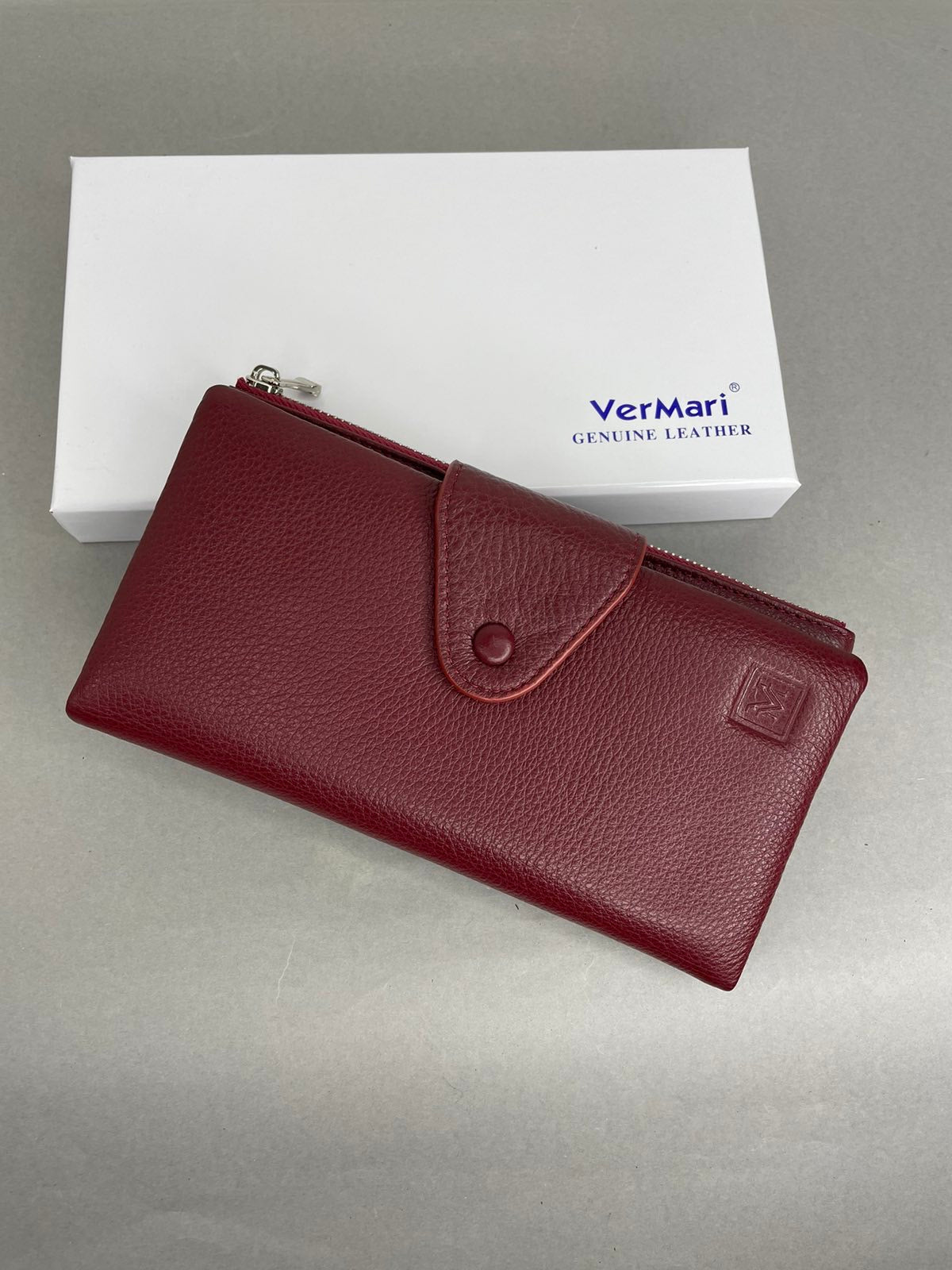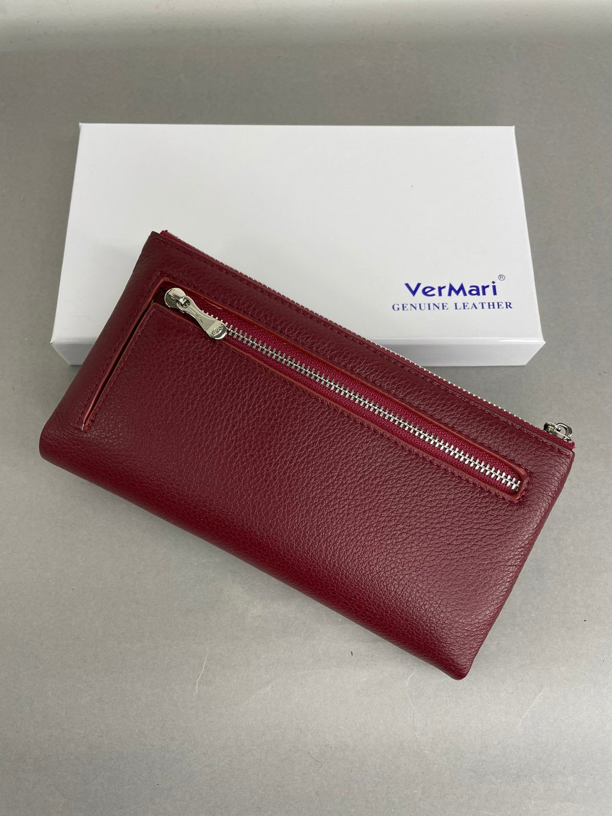 Natūralios odos, bordinės spalvos moteriška VerMari piniginė. Piniginės viduje yra 13 skyrelių kortelėms bei dvi užtrauktuku užsegamos kišenėles. VerMari piniginės moterims pasižymi itin minkšta, malonia laikyti rankoje oda bei kokybe.