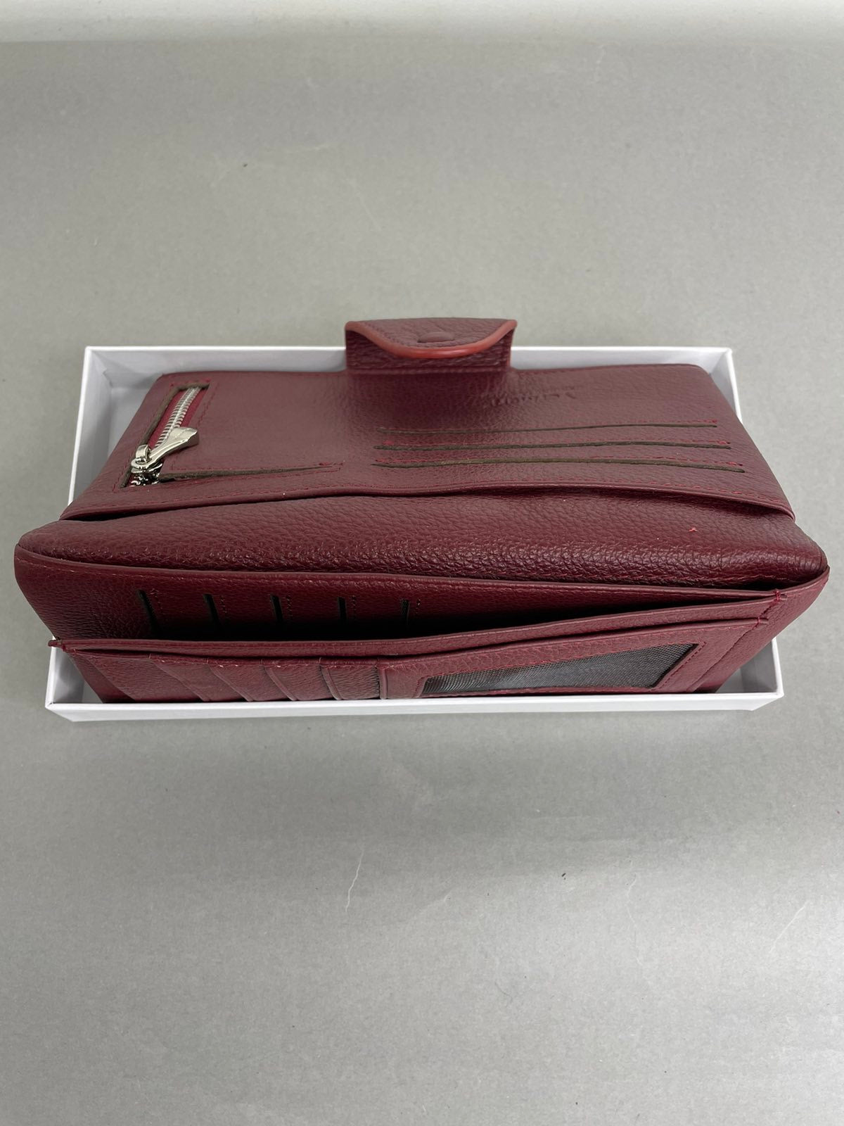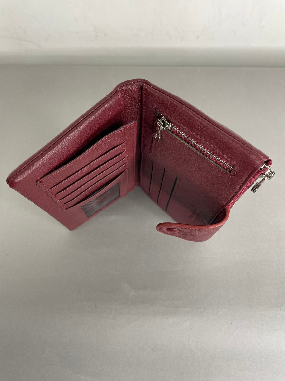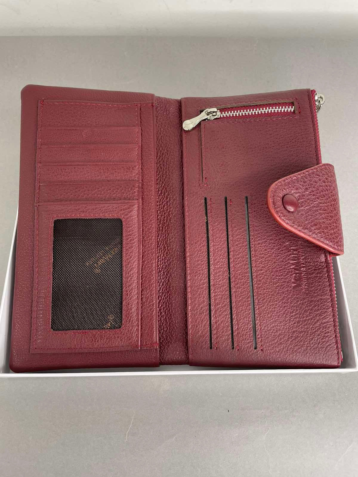 Natūralios odos, bordinės spalvos moteriška VerMari piniginė. Piniginės viduje yra 13 skyrelių kortelėms bei dvi užtrauktuku užsegamos kišenėles. VerMari piniginės moterims pasižymi itin minkšta, malonia laikyti rankoje oda bei kokybe.