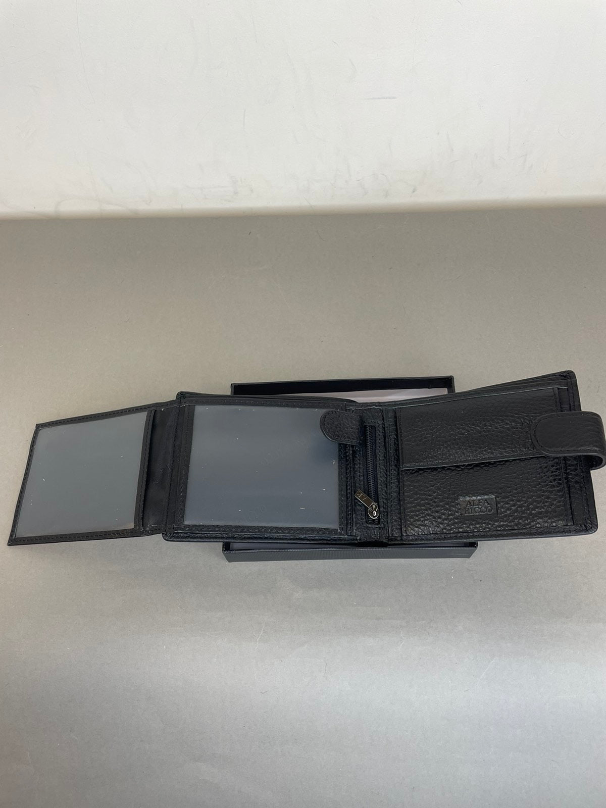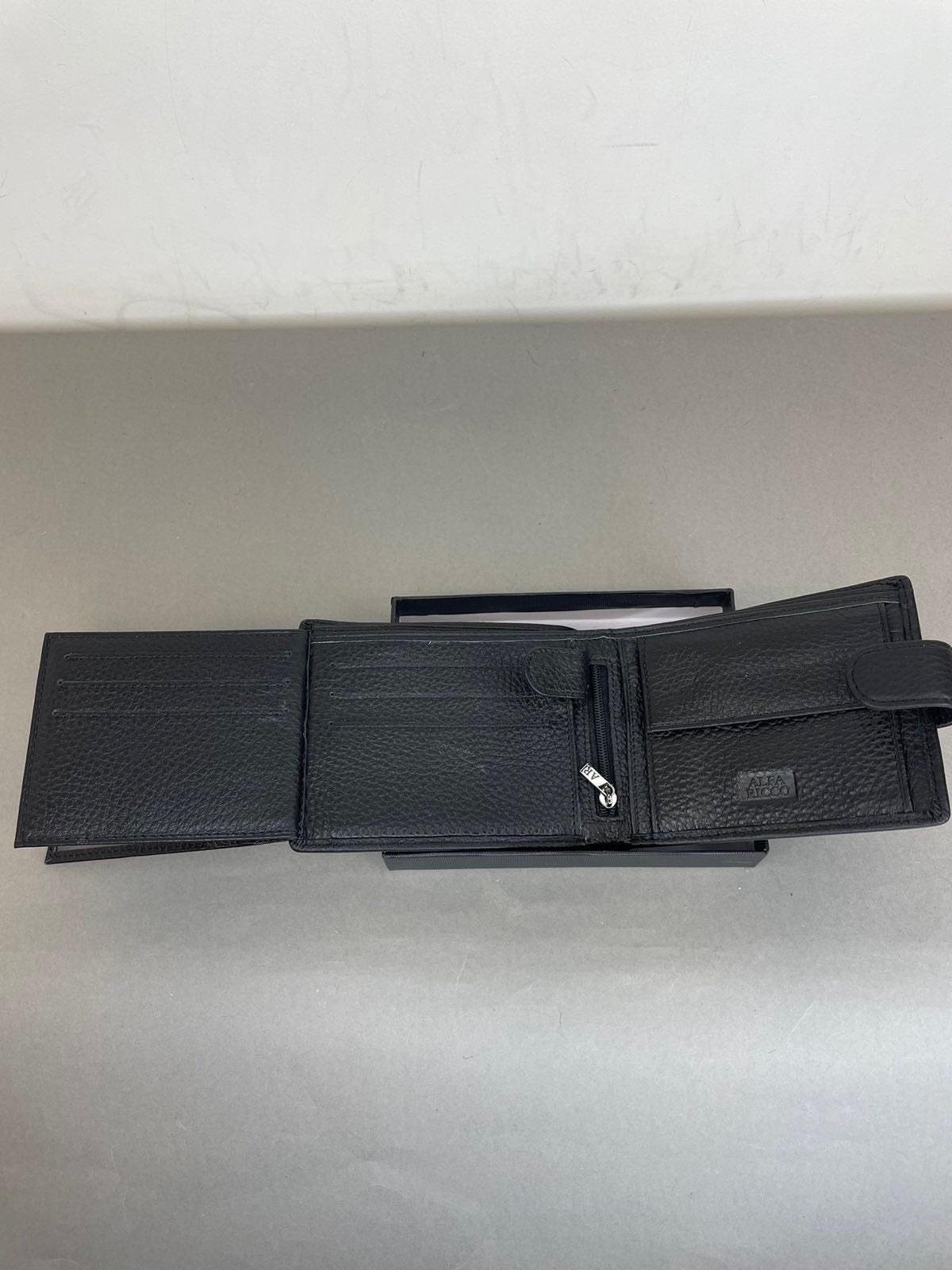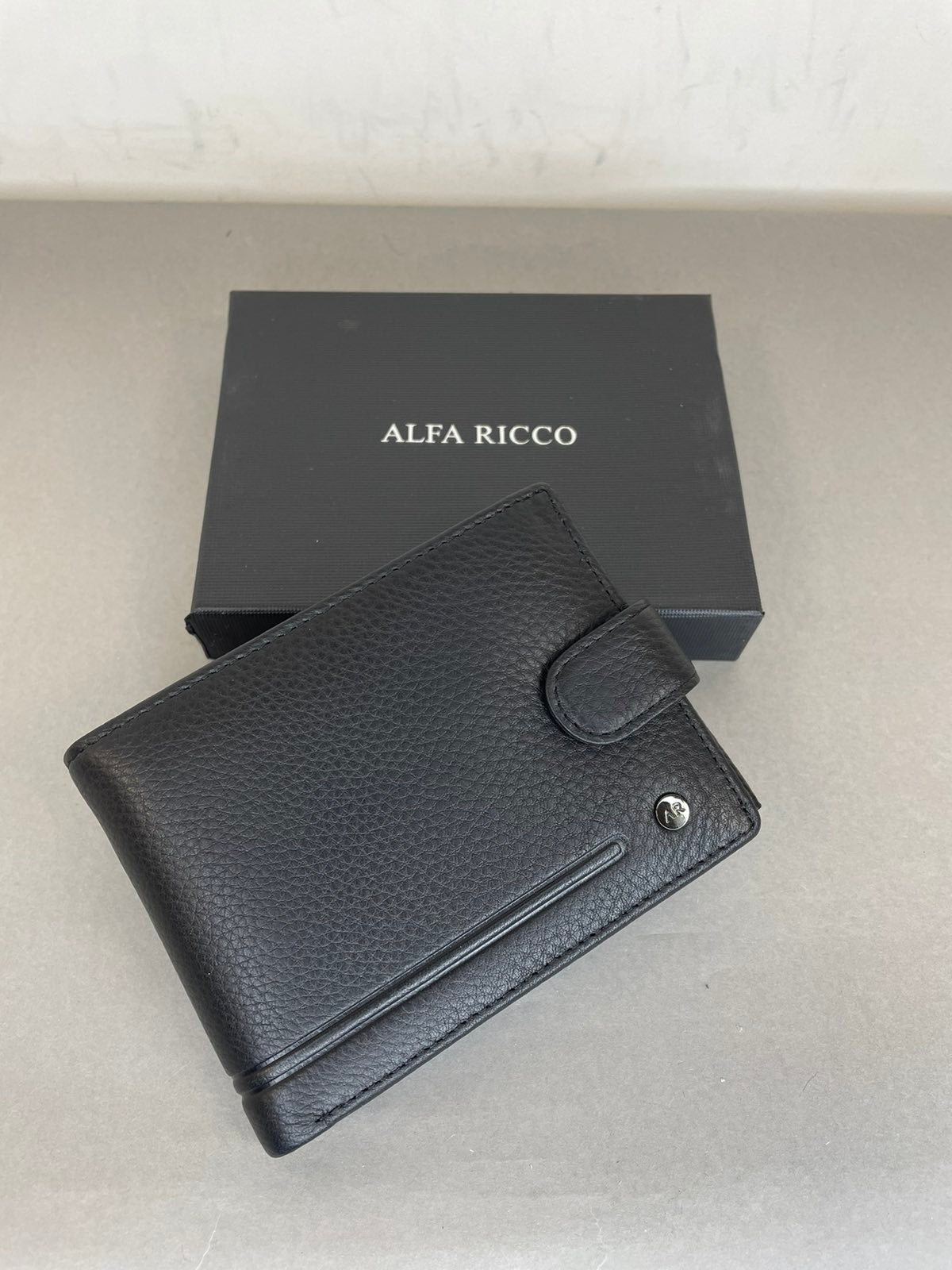 Vyriška natūralios odos piniginė Alfa Ricco su užsegimu. Piniginės oda minkšta ir maloni laikyti rankoje.