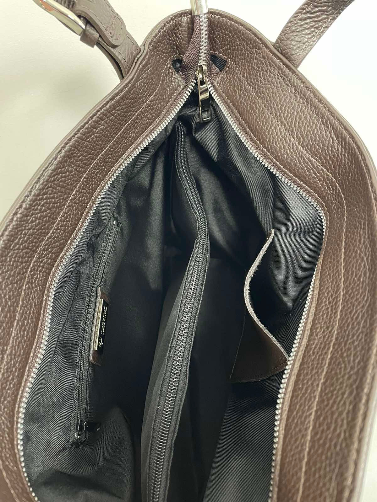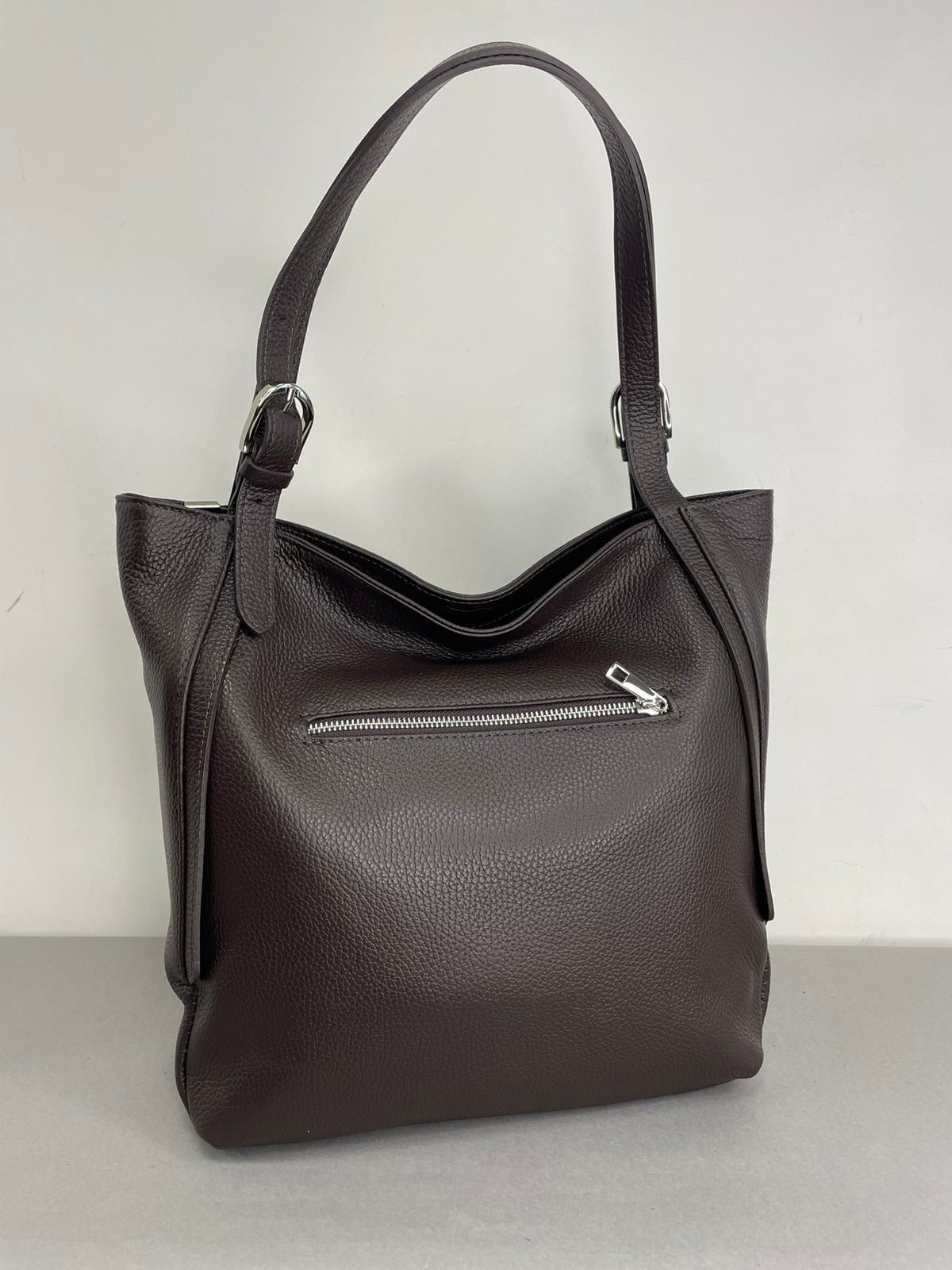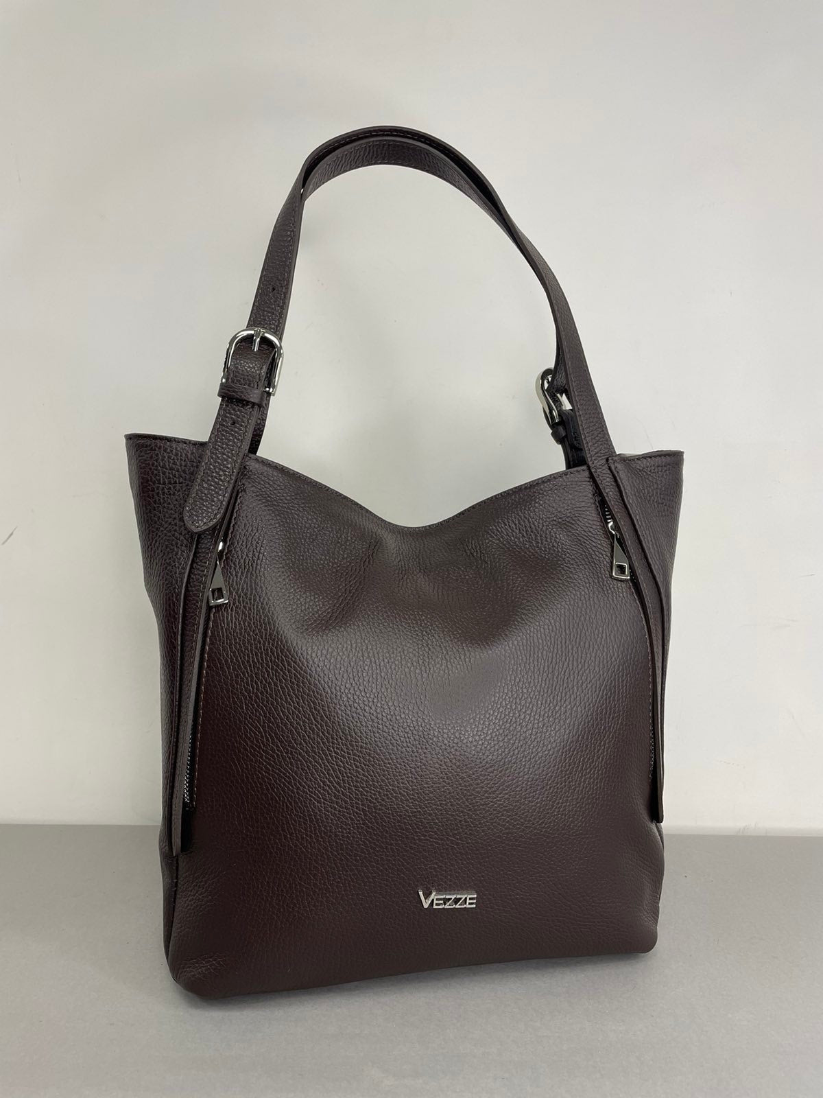 Italijoje pagaminta, Vezze firmos natūralios odos moteriška rankinė. Rudos spalvos rankinė su sidabrinės spalvos detalėmis, minkšta, tačiau savo formą išlaikanti.
