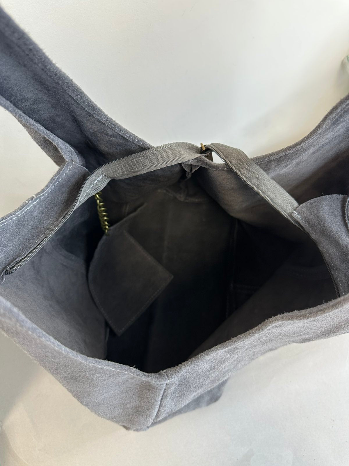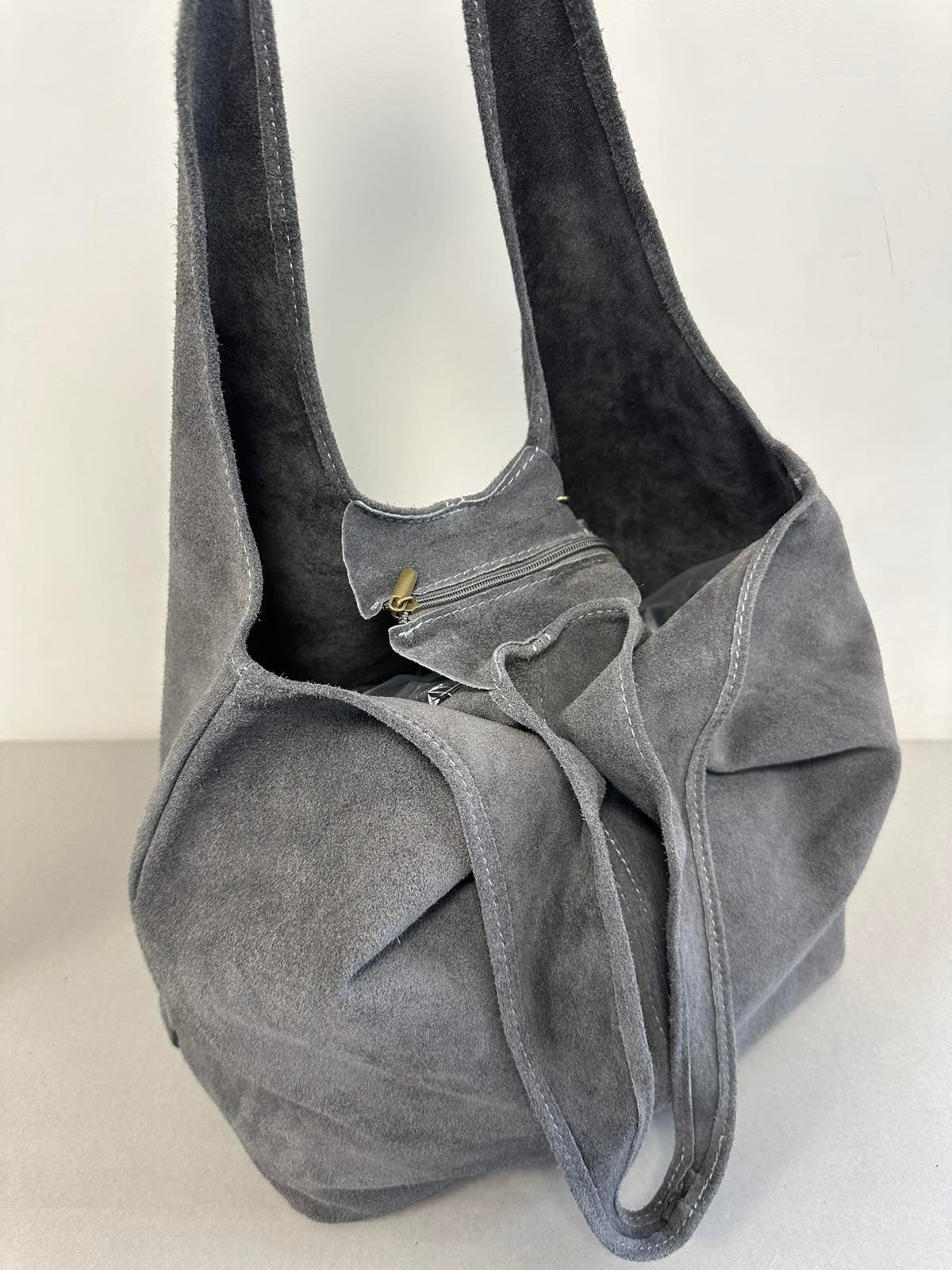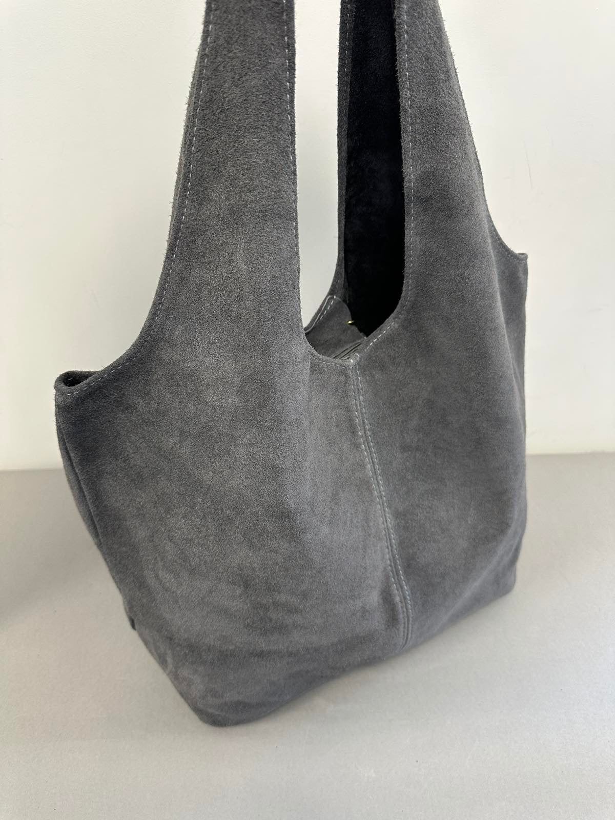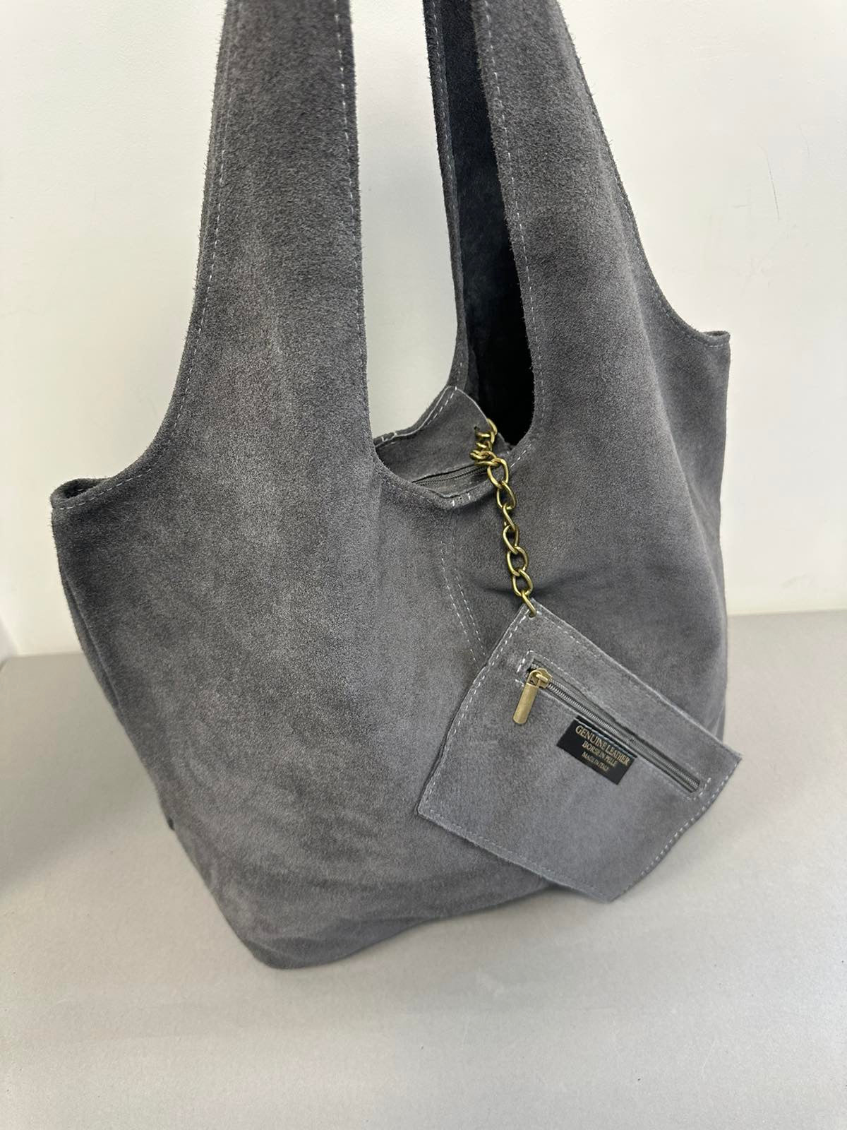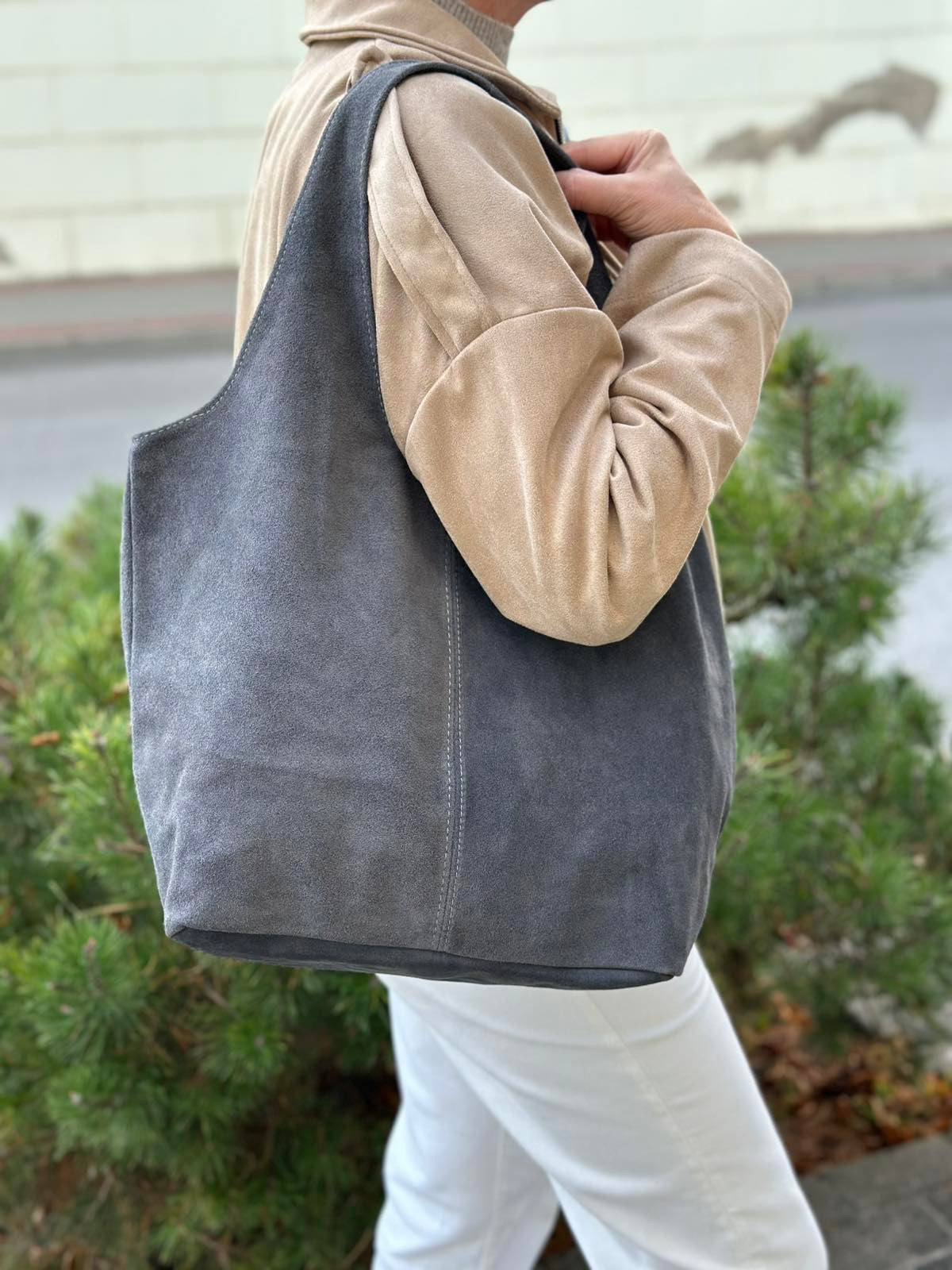 Pilka verstos natūralios odos moteriška rankinė.
