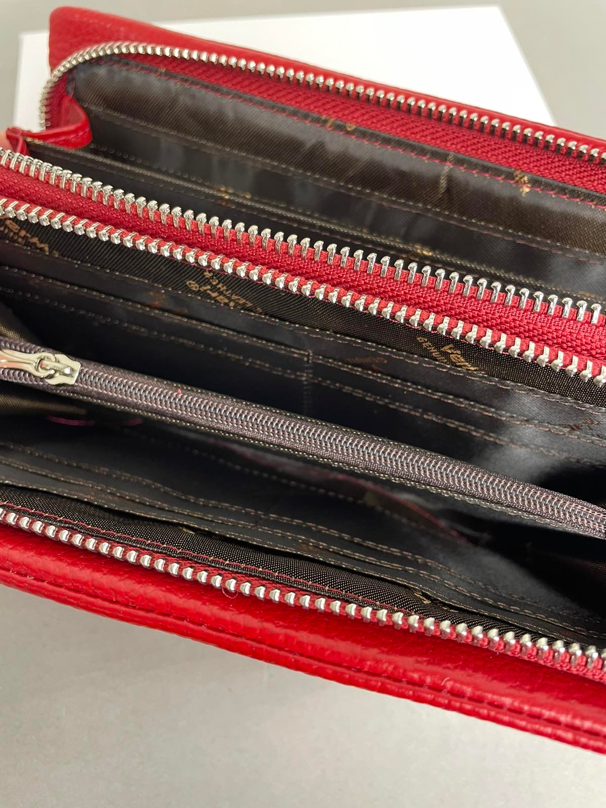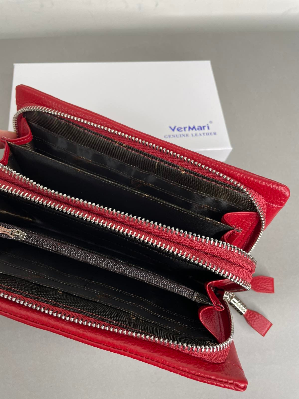 Raudonos spalvos, odinė VerMari moteriška pinginė su dvigubu užtrauktuku. VerMari piniginės pasižymi itin minkšta ir malonia laikyti rankoje oda. Šios piniginės viduje telpa 16 kortelių, yra skyrius su užtrauktuku monetoms bei skyriai kupiūroms.