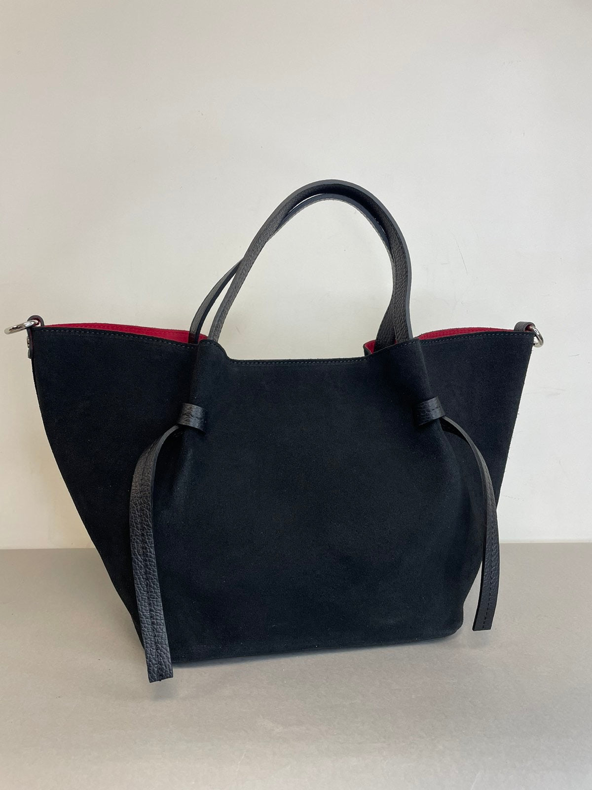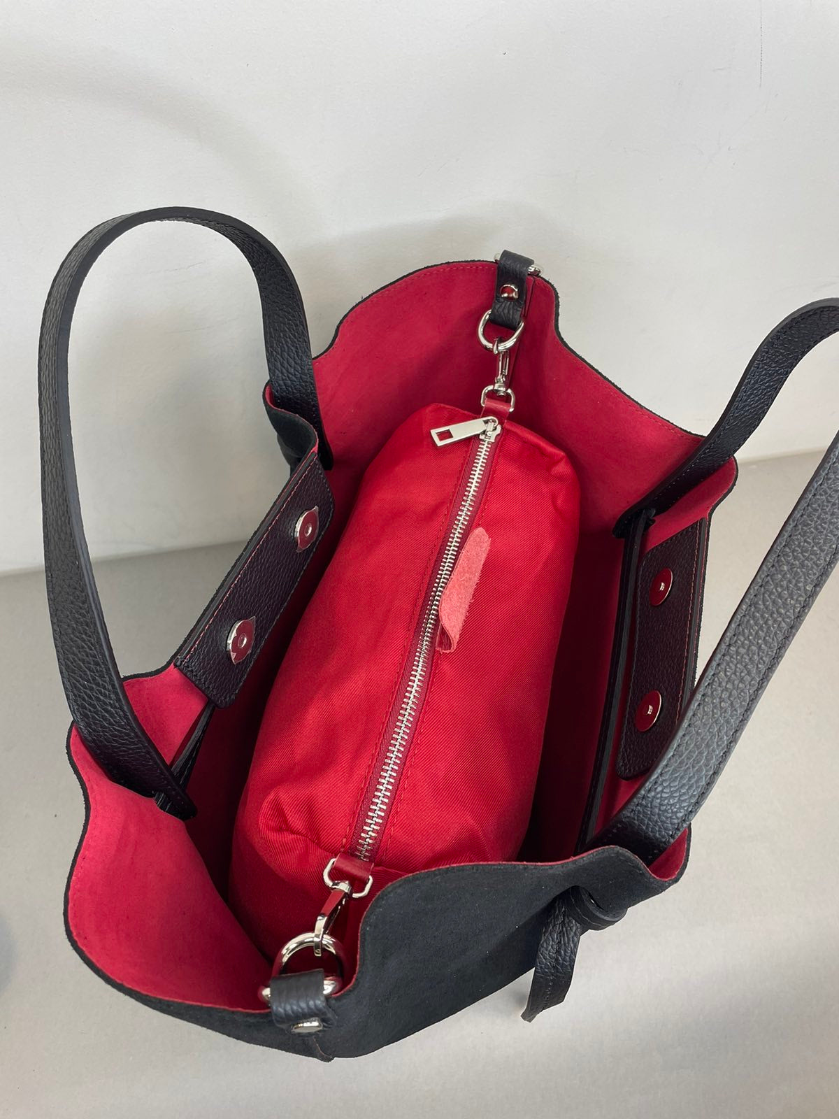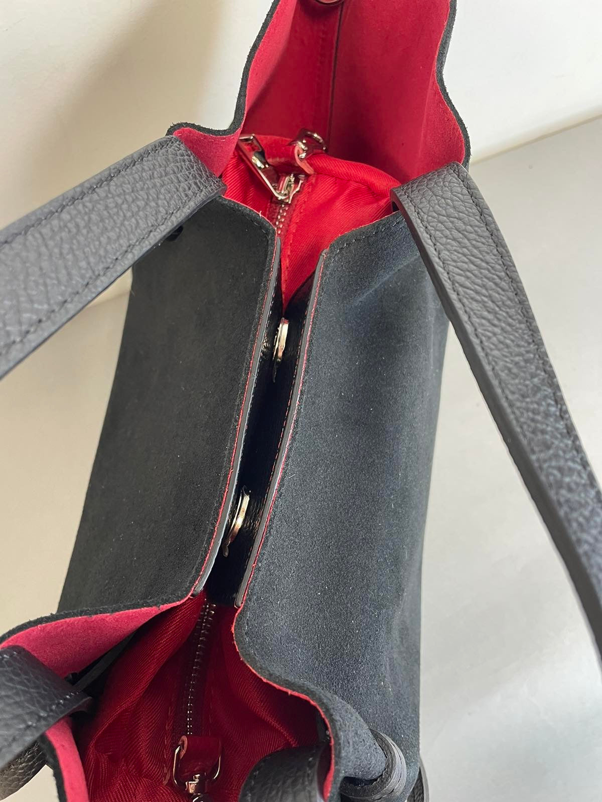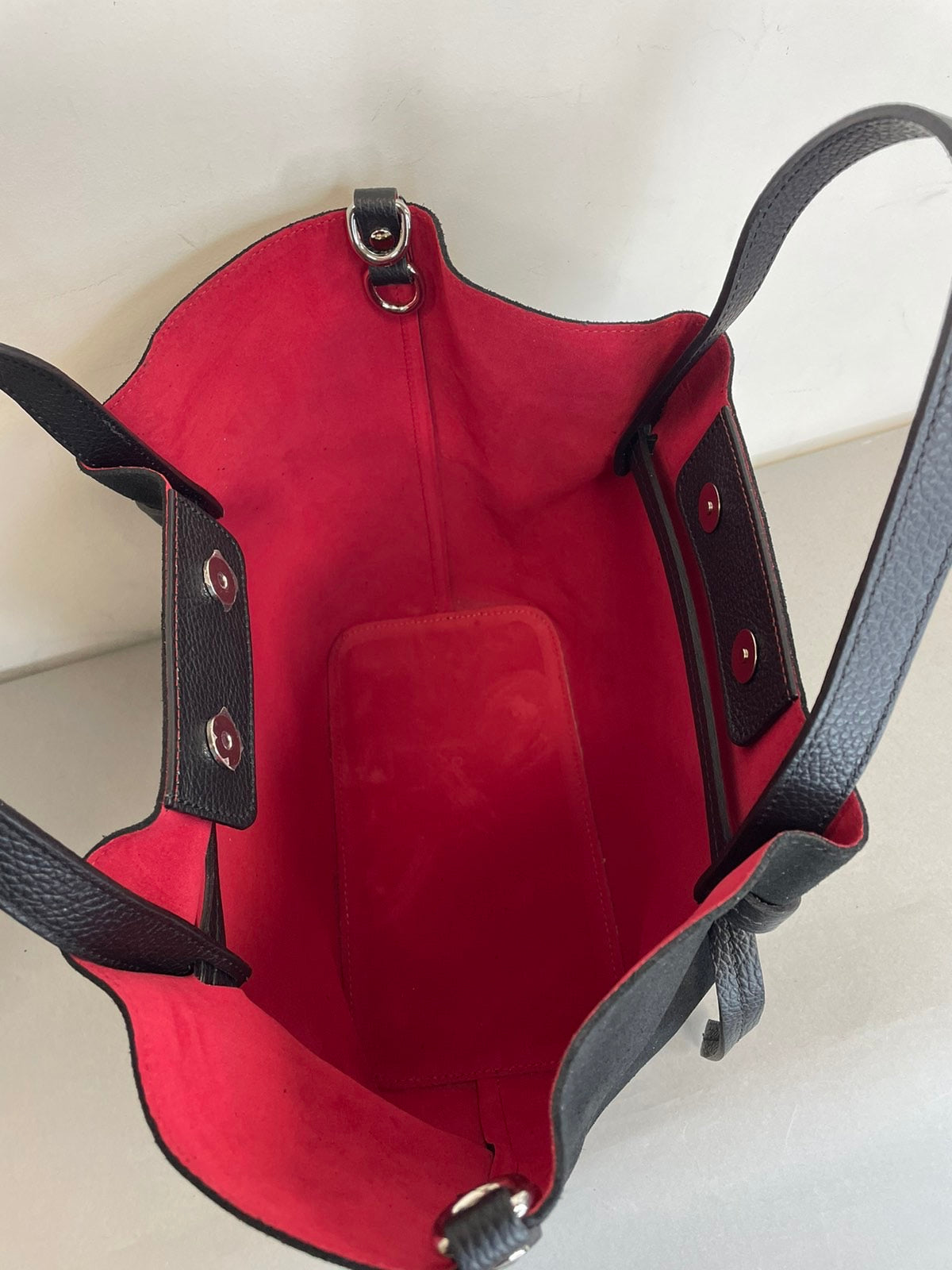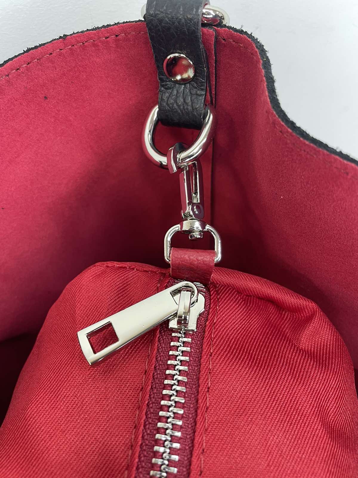 Natūralios odos moteriška rankinė su raudonos spalvos vidumi. Itališkos odinės rankinės pasižymi aukšta kokybe ir stilingu dizainu.