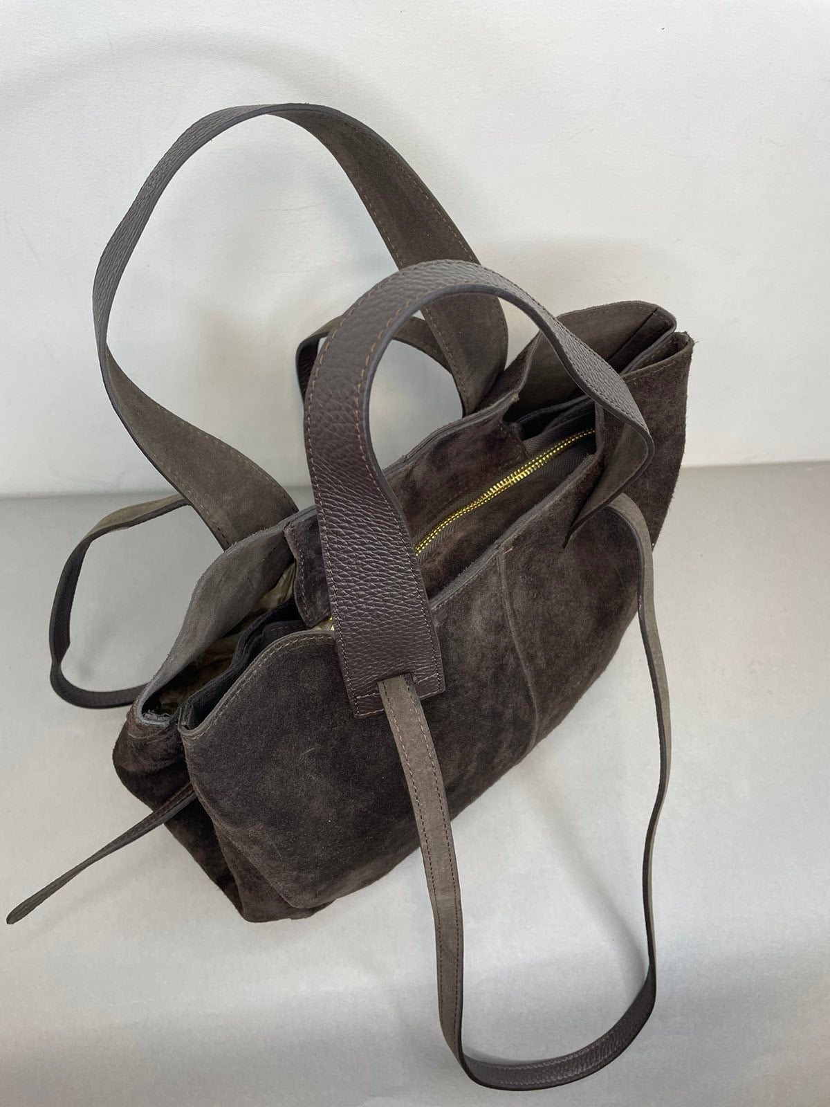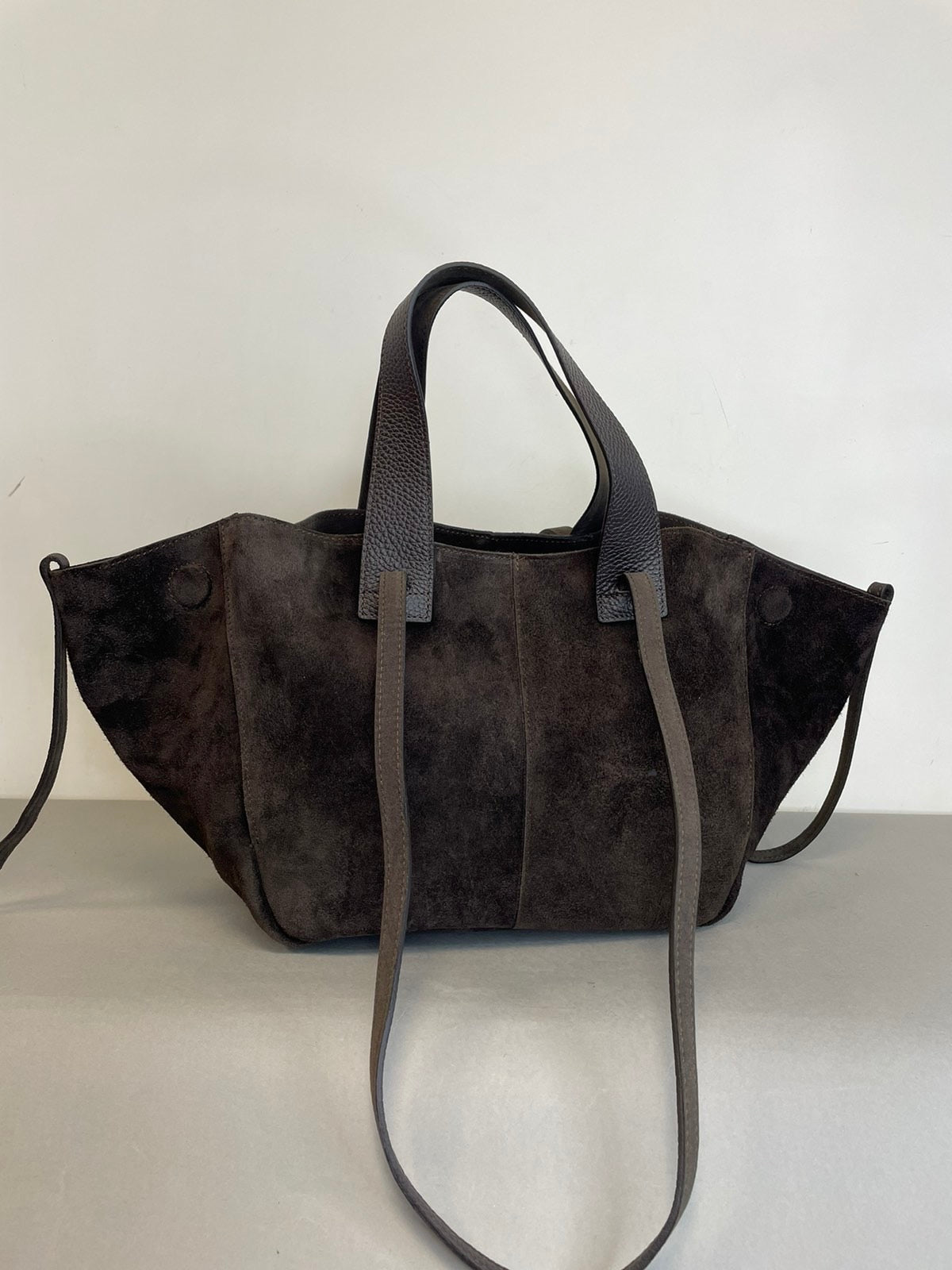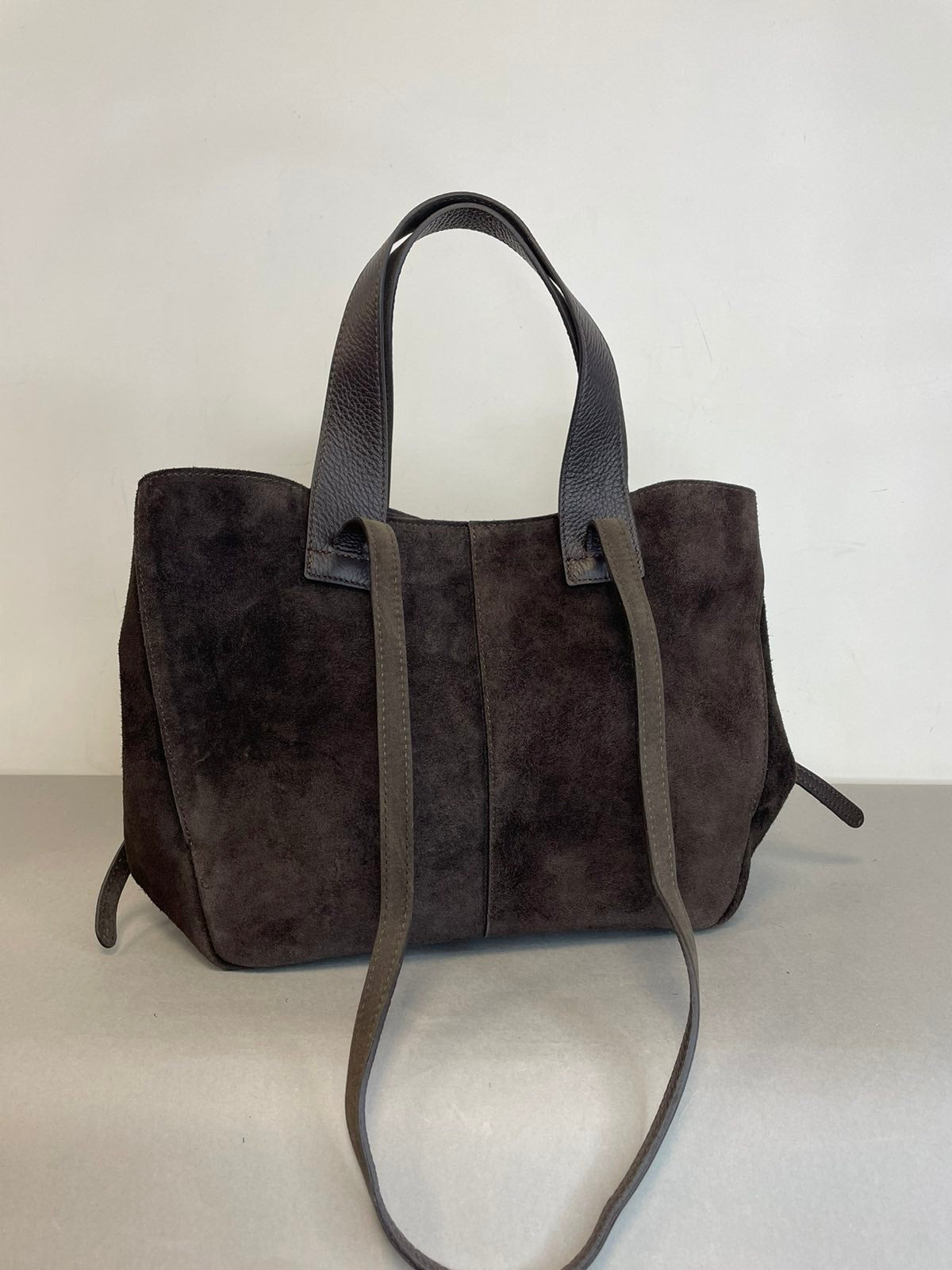 Stilinga natūralios verstos odos rankinė. Šis rankinės modelis lyg dvi rankinės vienoje, dėl rankinės šonų, kurie leidžia pakeisti į du skirtingai atrodančius modelius.