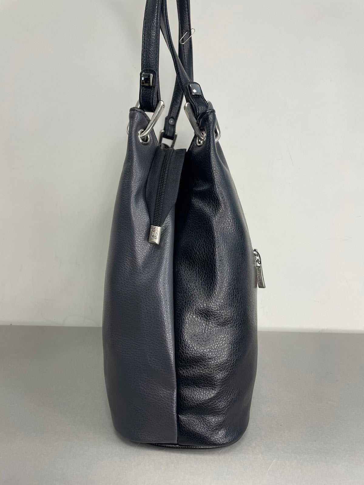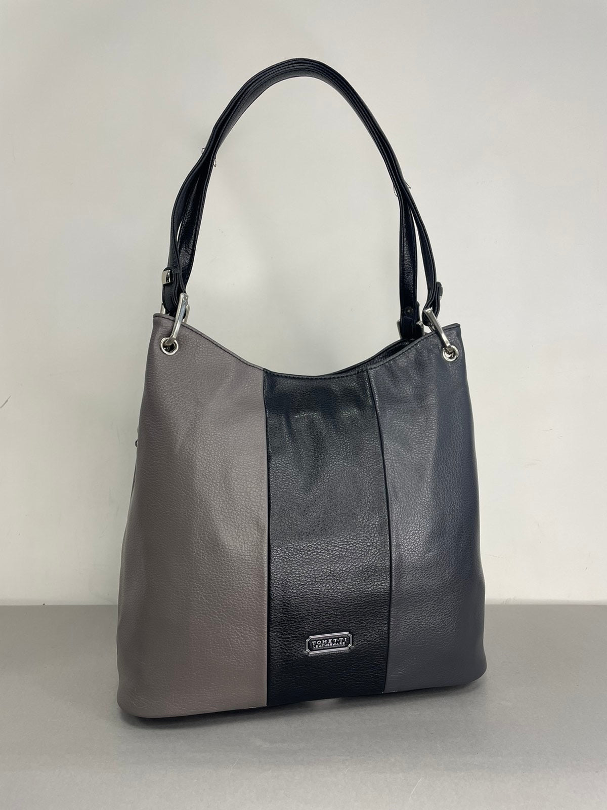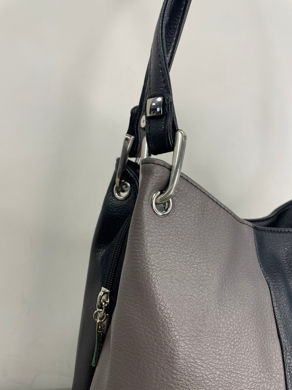 Moteriška Gilda Tohetti rankinė, juodos spalvos, priekyje kombinuota su pilkos spalvos detalėmis. Rankinė turi dvi ilgas rankenas nešiojimui ant peties.