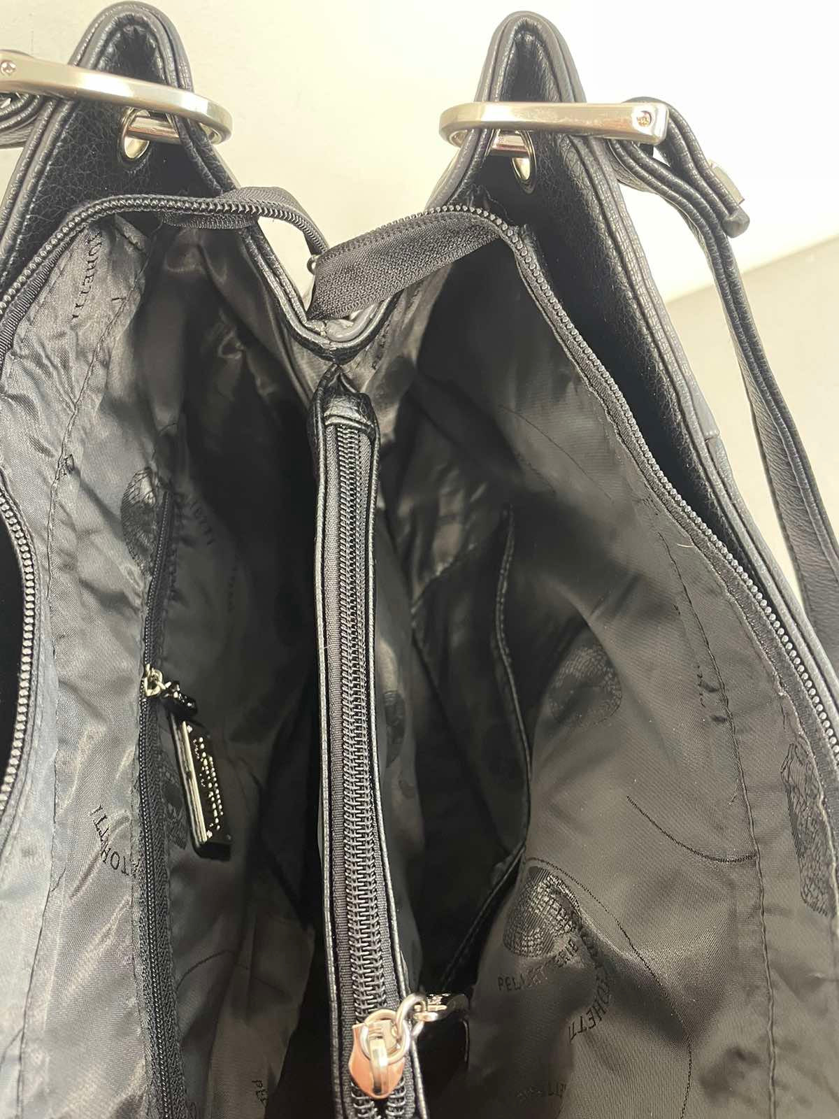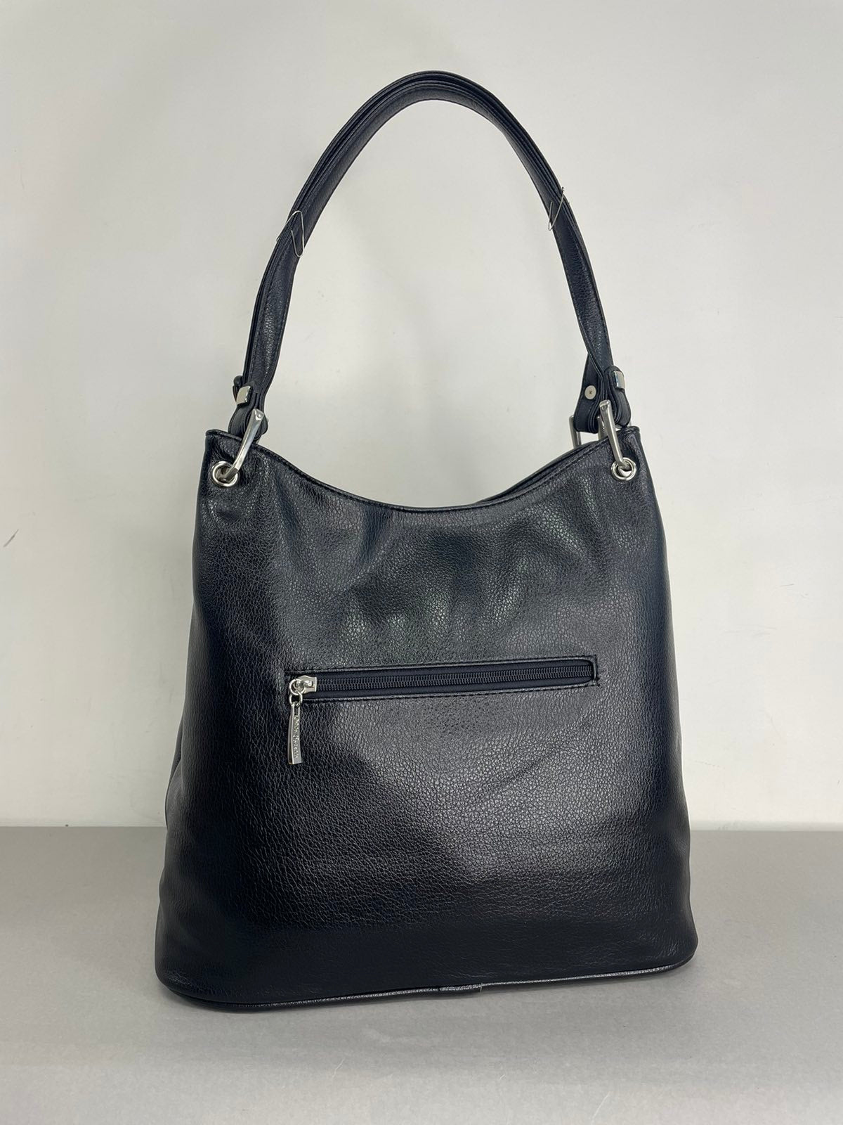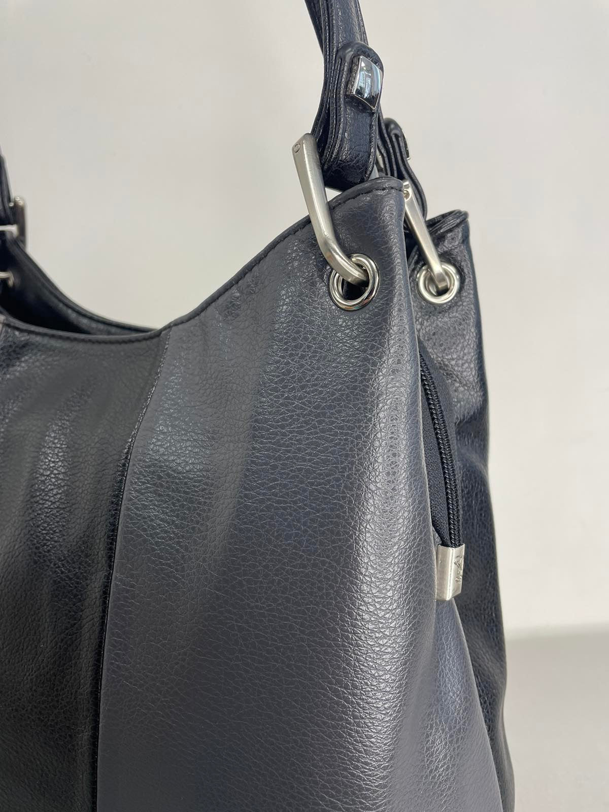 Moteriška Gilda Tohetti rankinė, juodos spalvos, priekyje kombinuota su pilkos spalvos detalėmis. Rankinė turi dvi ilgas rankenas nešiojimui ant peties.