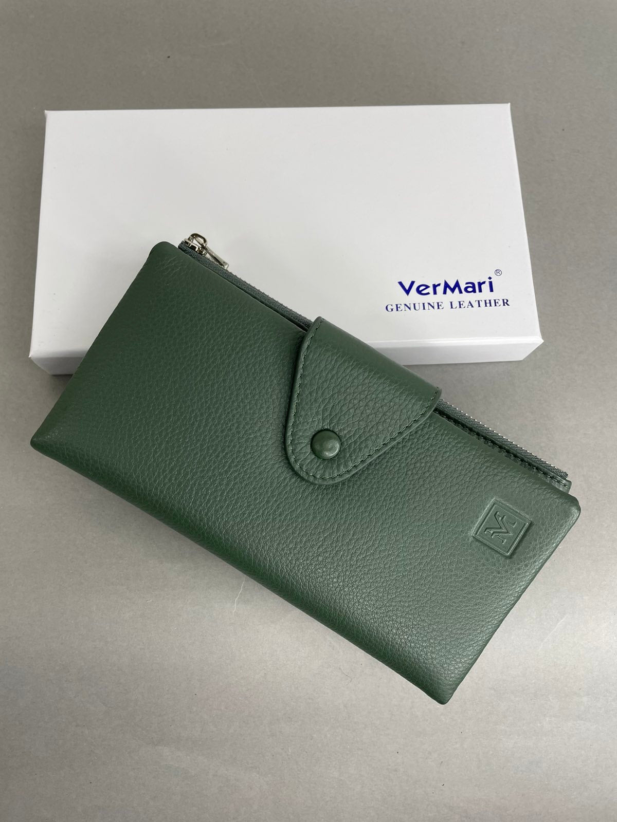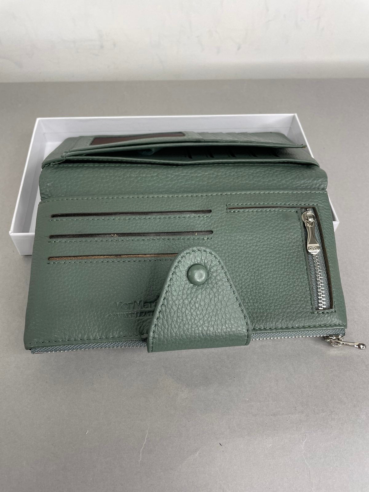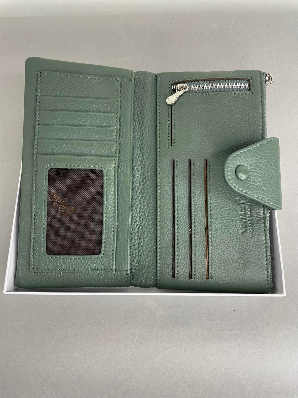 Natūralios odos, žalios spalvos moteriška VerMari piniginė. Piniginės viduje yra 13 skyrelių kortelėms bei dvi užtrauktuku užsegamos kišenėles. VerMari piniginės moterims pasižymi itin minkšta, malonia laikyti rankoje oda bei kokybe.