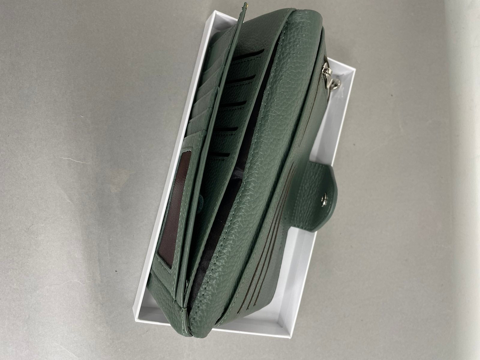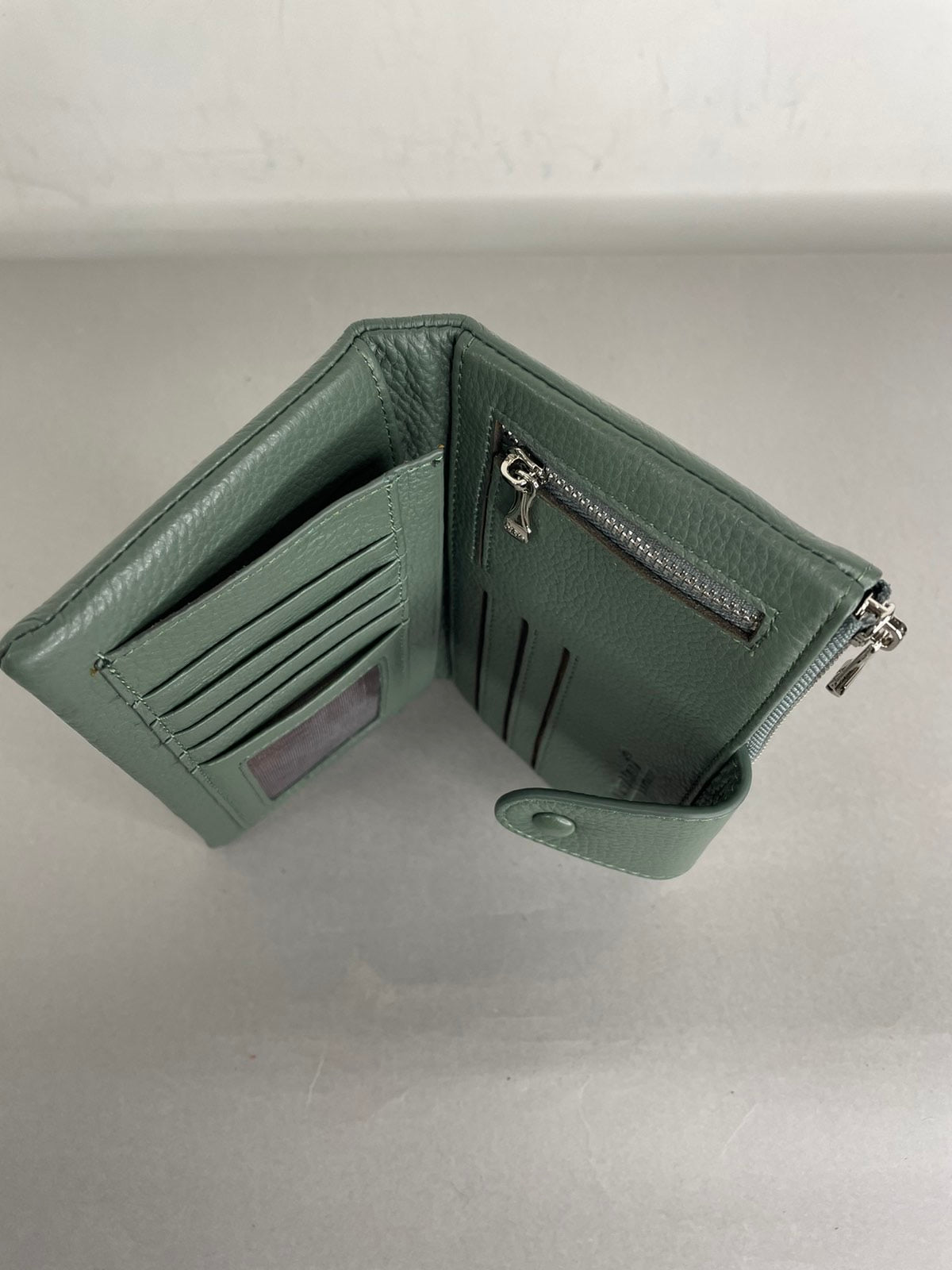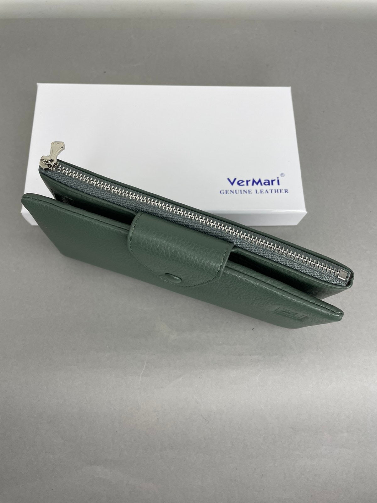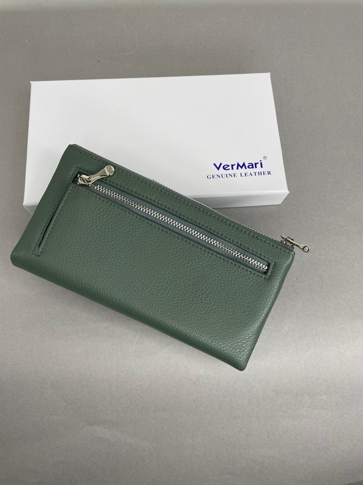 Natūralios odos, žalios spalvos moteriška VerMari piniginė. Piniginės viduje yra 13 skyrelių kortelėms bei dvi užtrauktuku užsegamos kišenėles. VerMari piniginės moterims pasižymi itin minkšta, malonia laikyti rankoje oda bei kokybe.