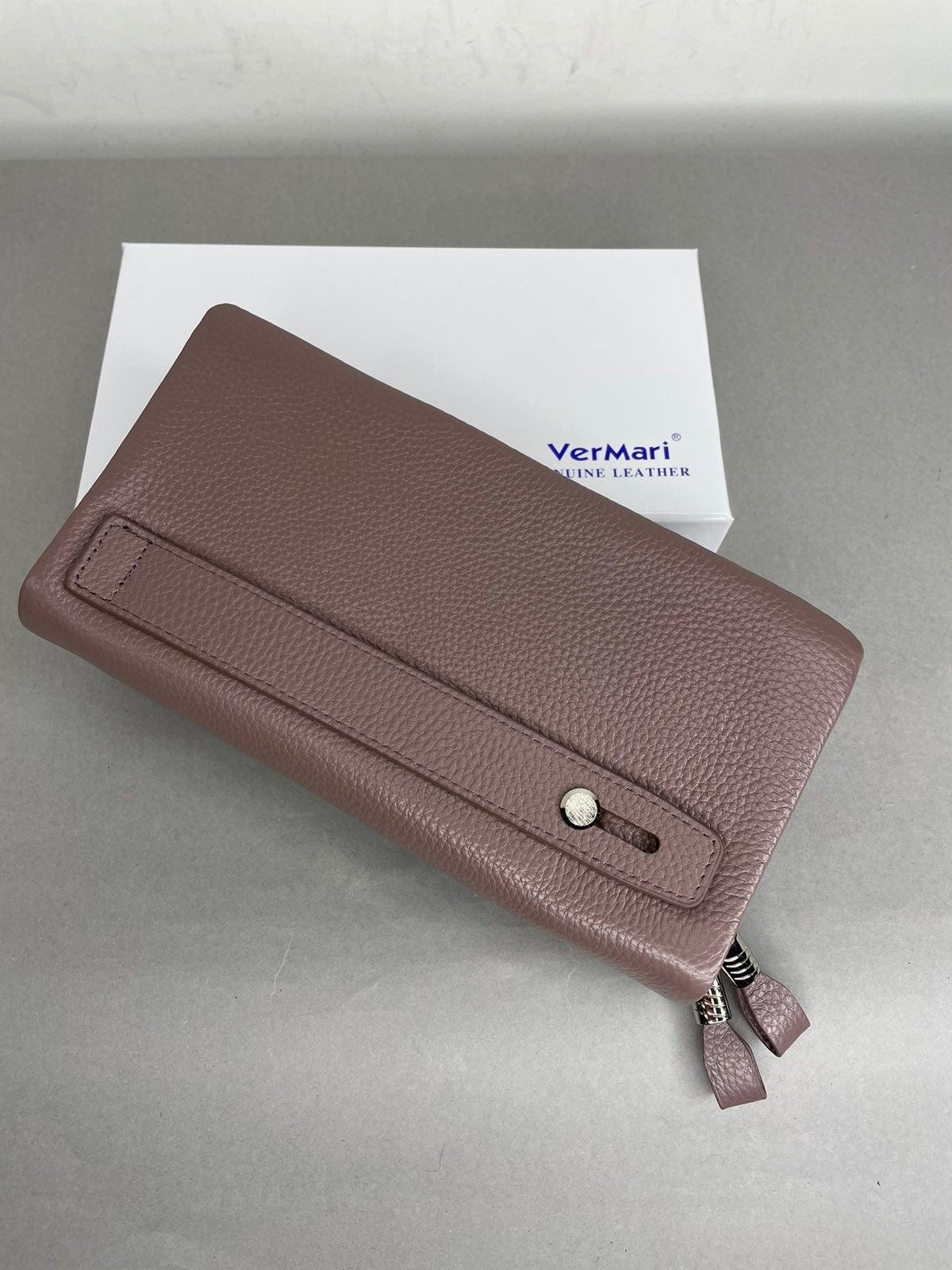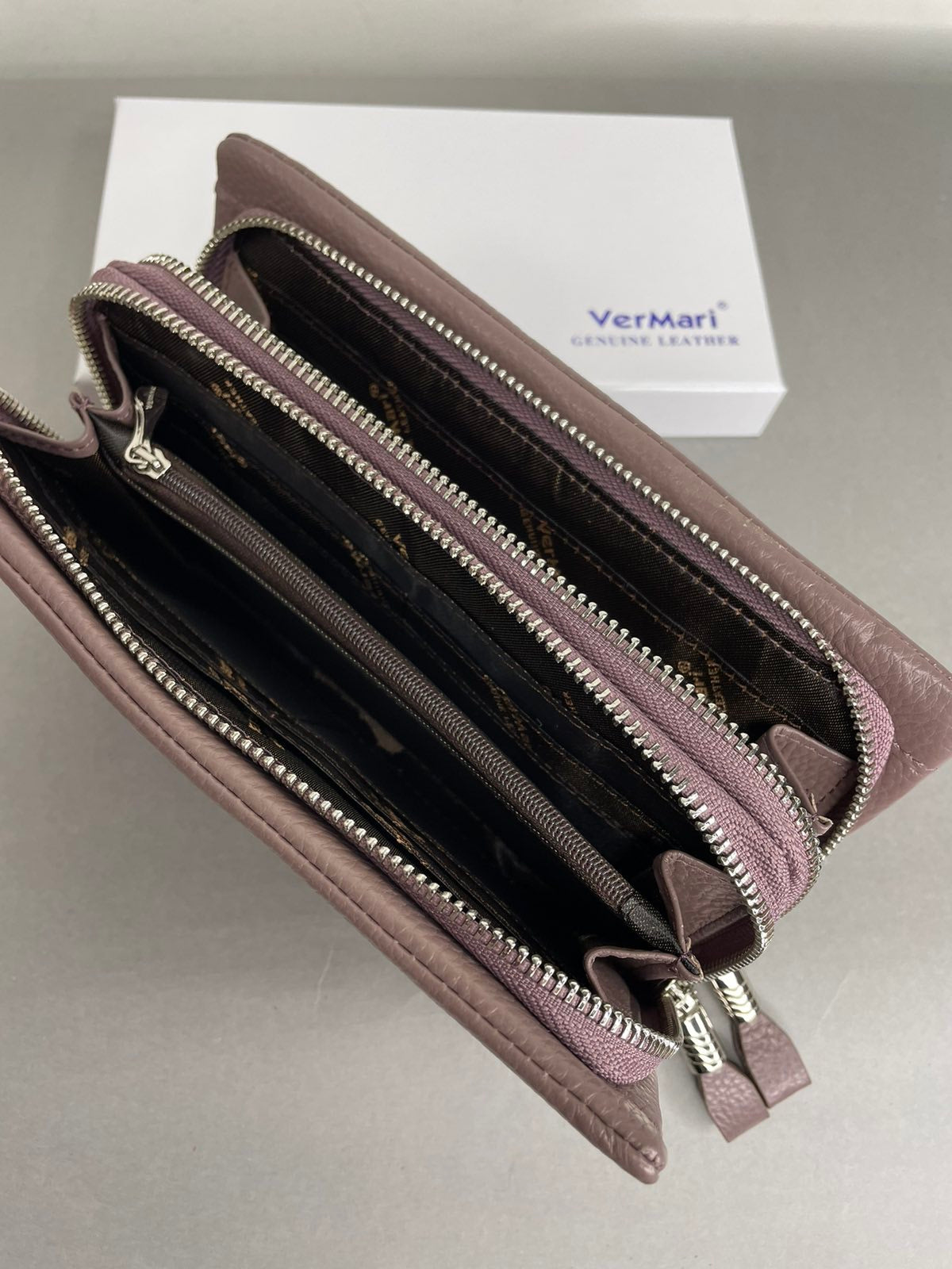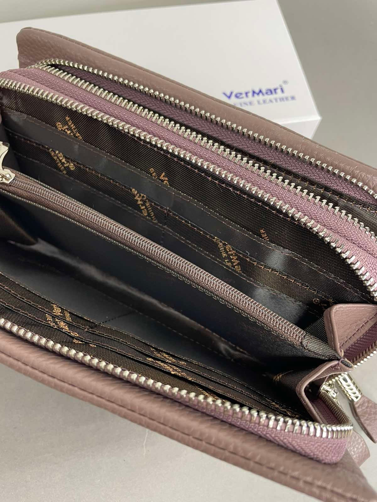 Pelenų rožės spalvos, odinė VerMari moteriška pinginė su dvigubu užtrauktuku. VerMari piniginės pasižymi itin minkšta ir malonia laikyti rankoje oda. Šios piniginės viduje telpa 16 kortelių, yra skyrius su užtrauktuku monetoms bei skyriai kupiūroms.