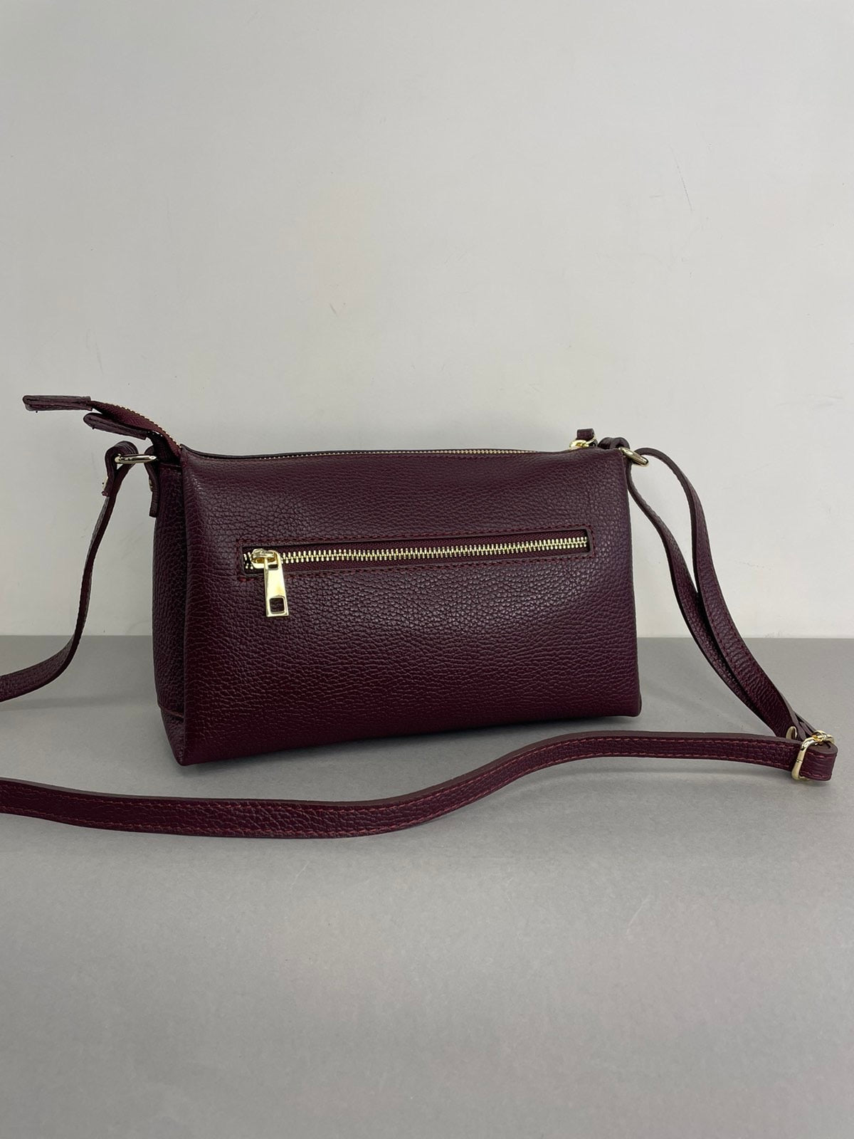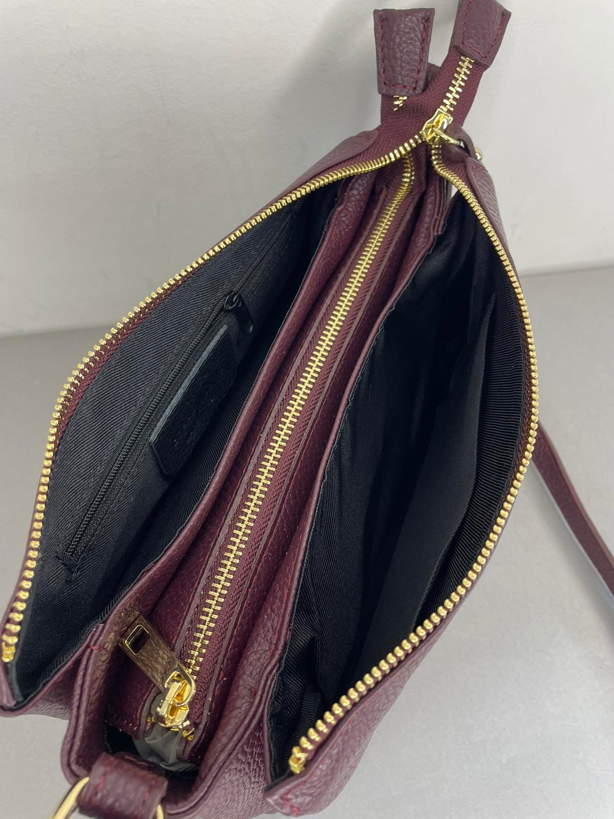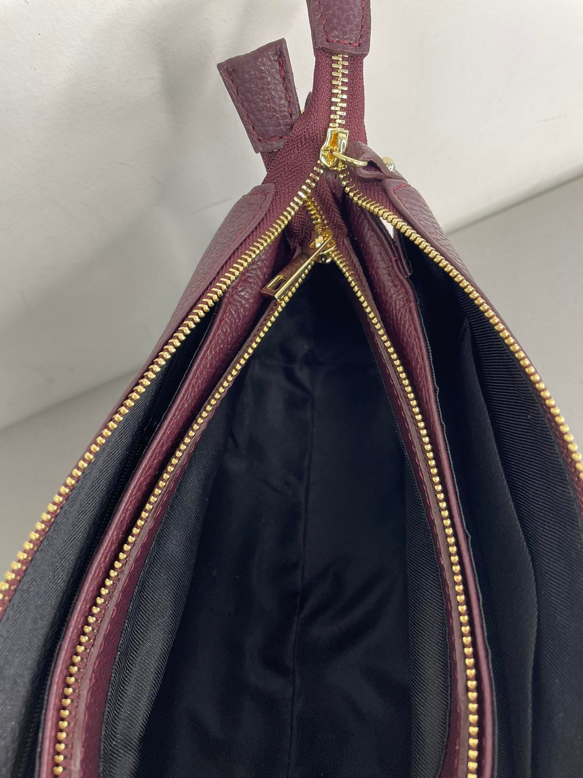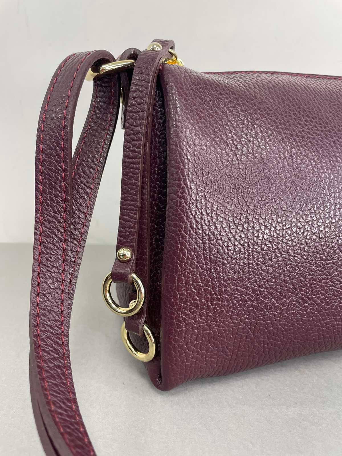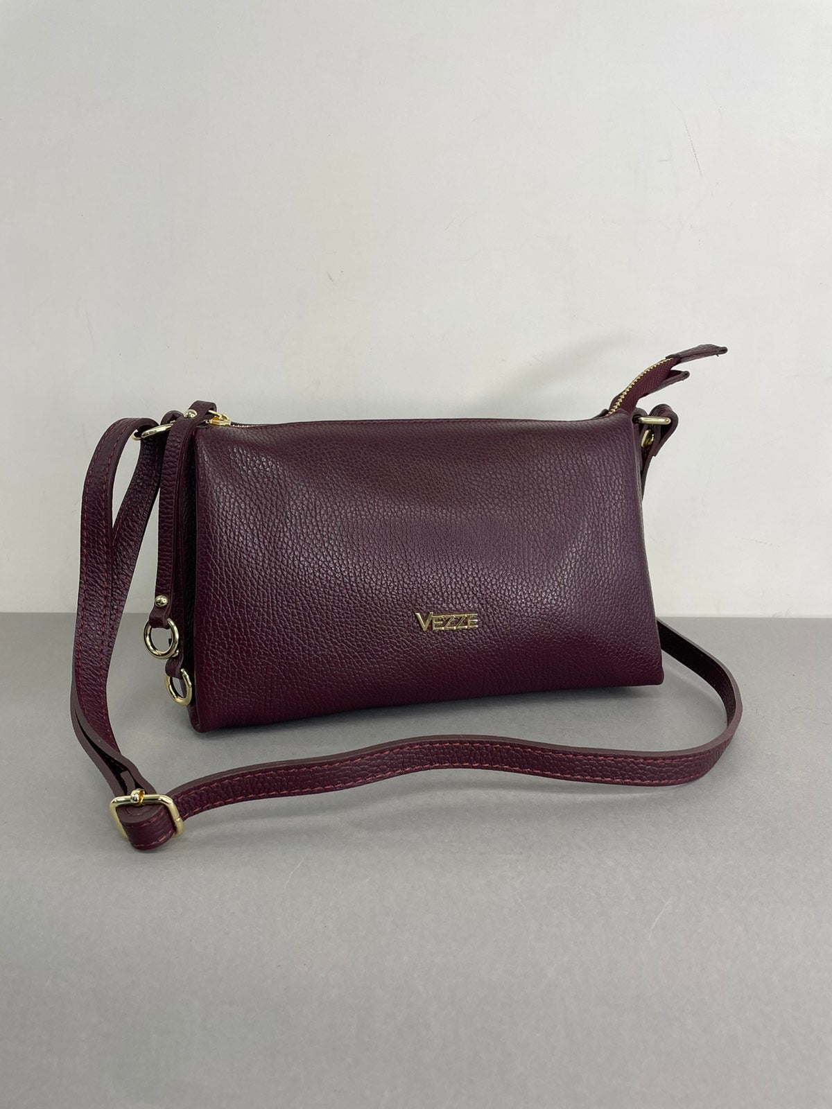 Itališka, Vezze natūralios odos moteriška rankinė per petį. Bordinės spalvos raninė, išlaikanti savo formą, viduje turi tris skyrelius. Rankinės priekį puošia nedidelis Vezze ženklelis. Itališkos odinės Vezze rankinės pasižymi aukšta kokybe ir stilingu dizainu.