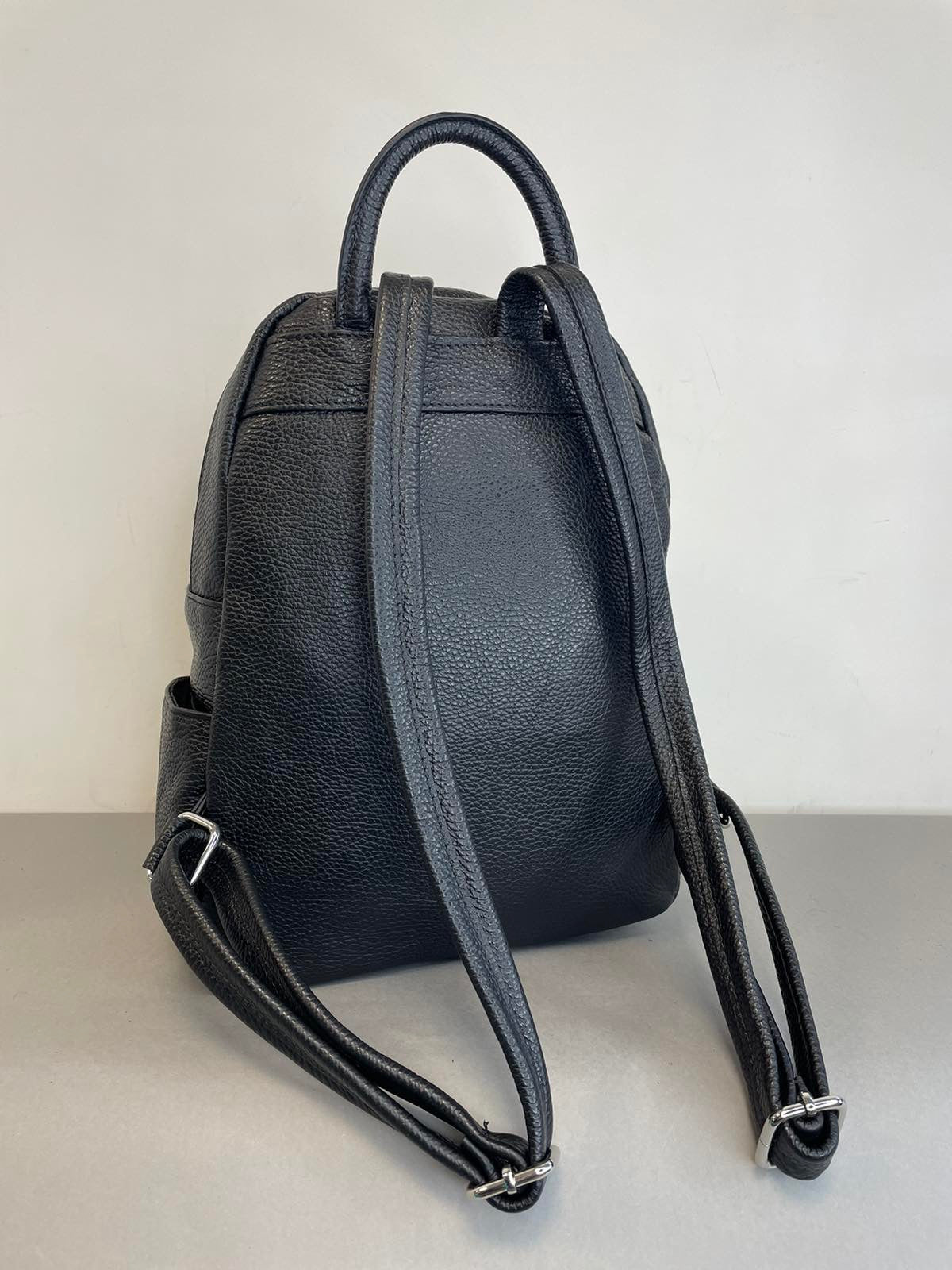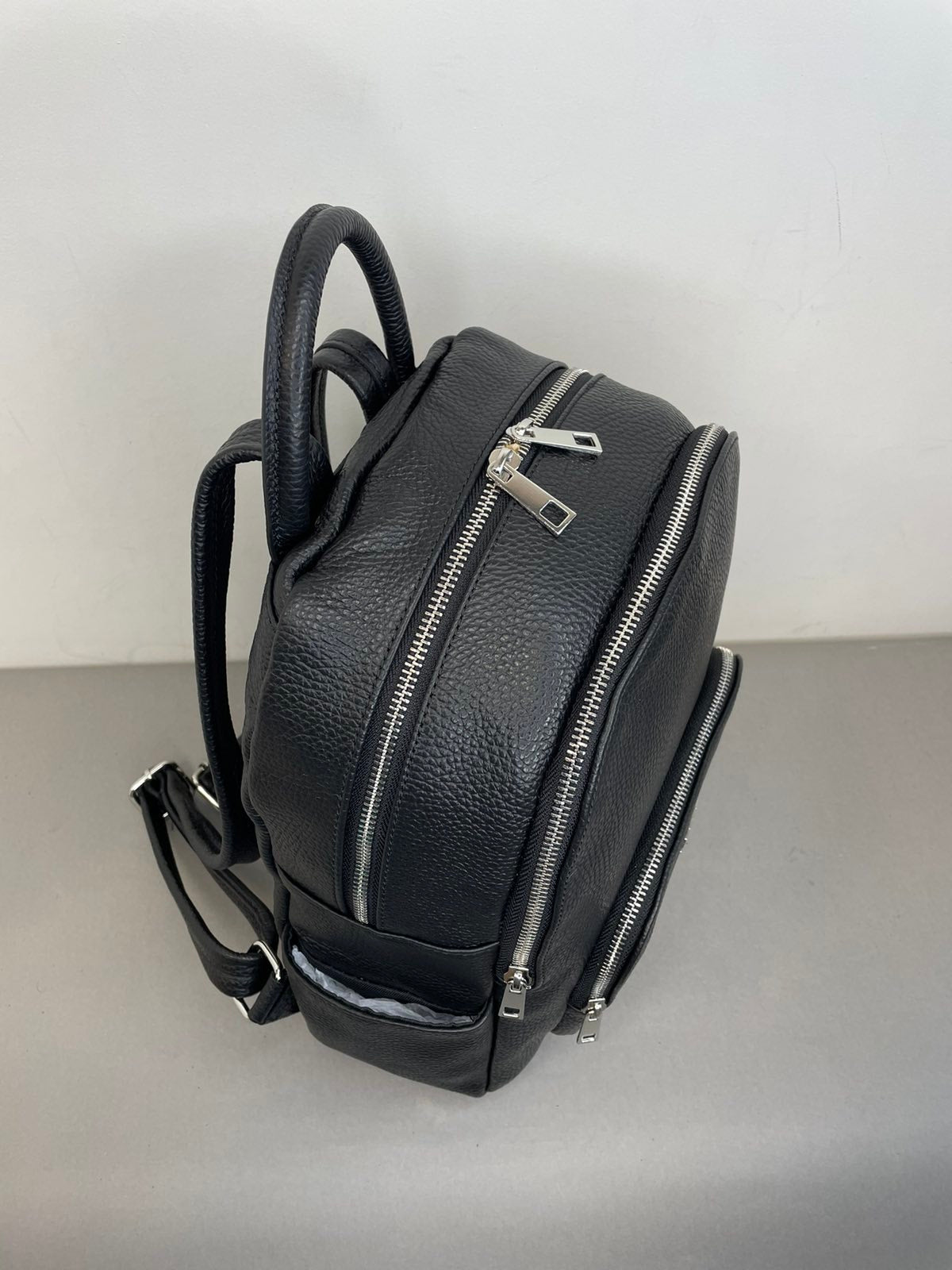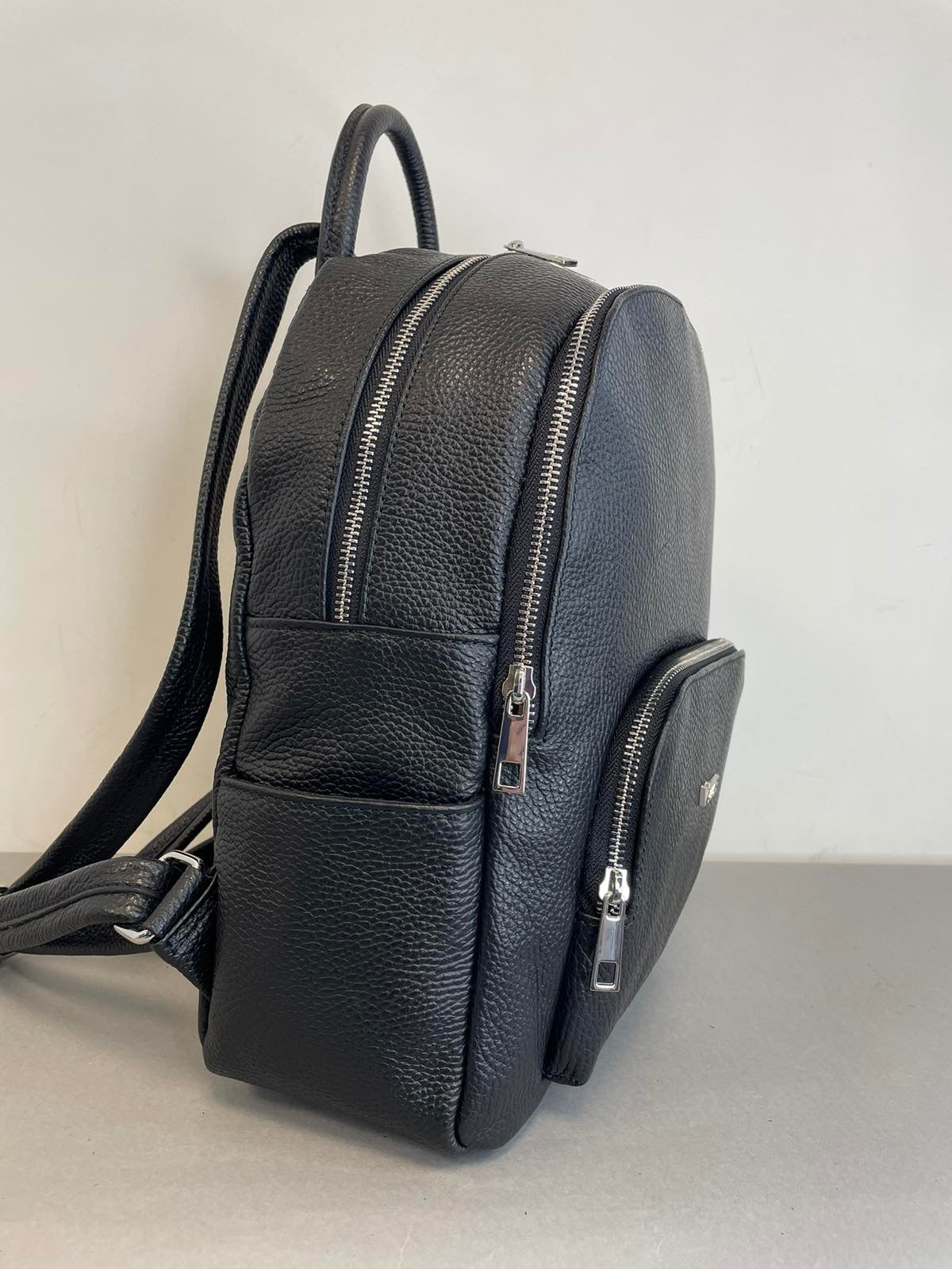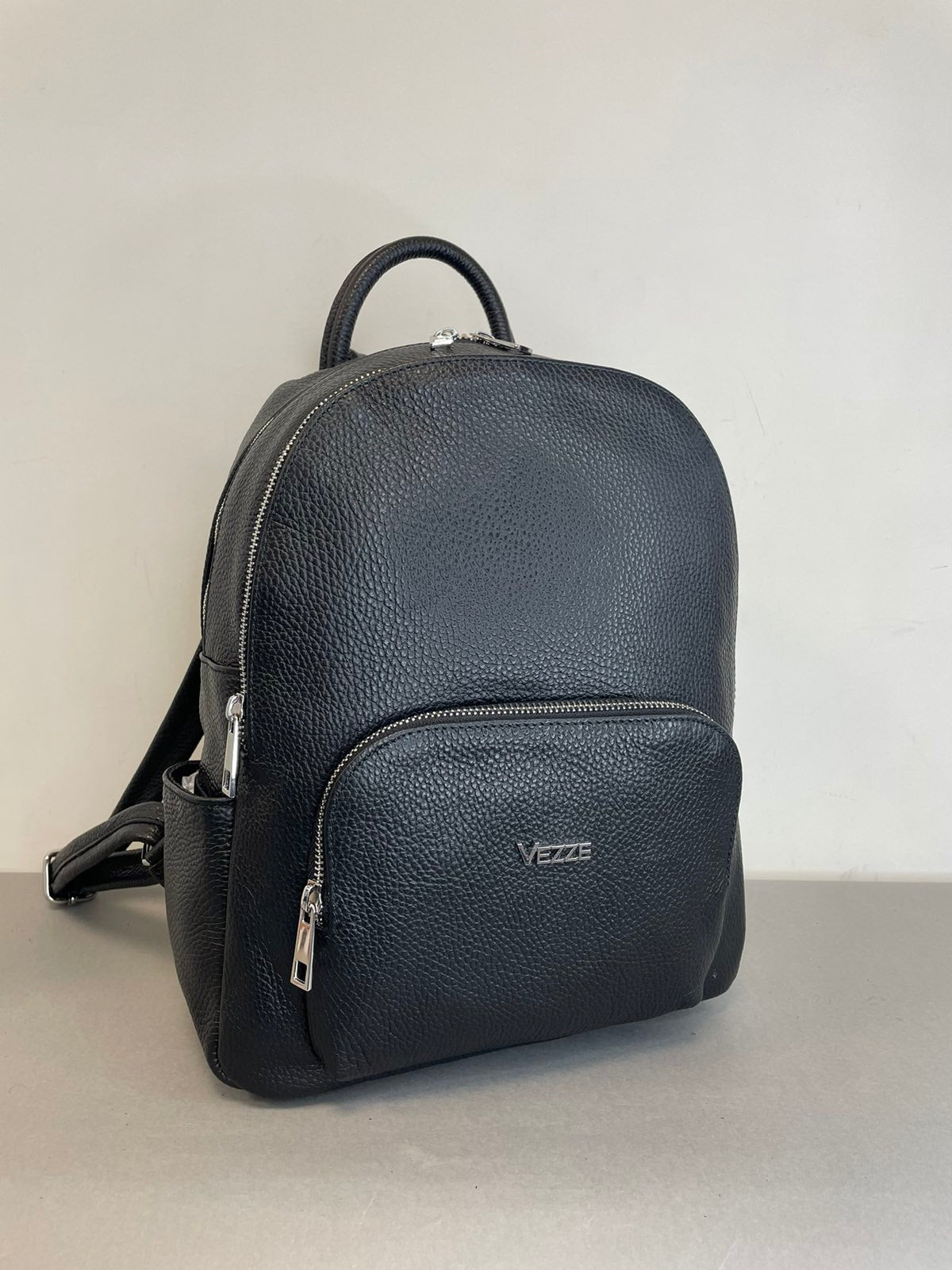 Moteriška natūralios odos, Vezze firmos kuprinė. Kuprinė pagaminta iš tvirtos ir kokybiškos natūralios odos, kuri leidžia išlaikyti savo formą. Kuprinei žavesio suteikia sidabrinės spalvos detalės ir užtrauktukai.