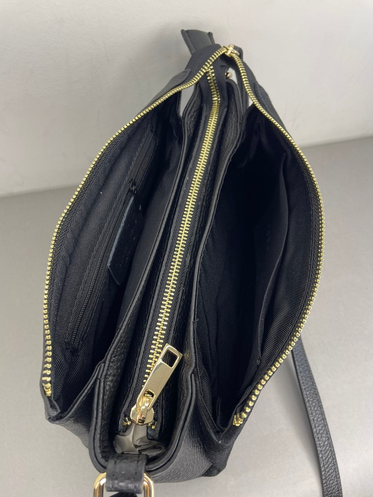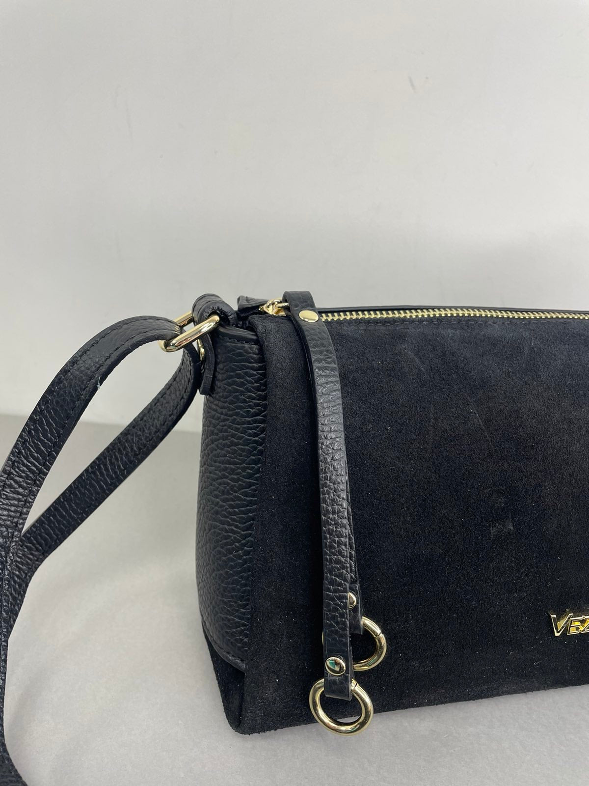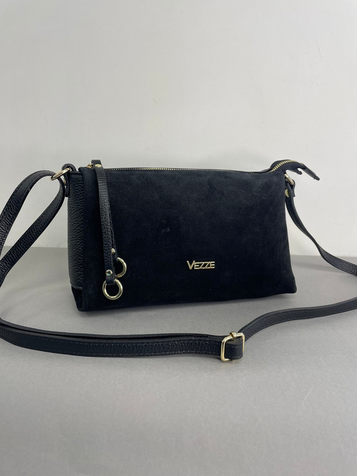 Itališka, Vezze natūralios verstos odos moteriška rankinė per petį. Juodos spalvos raninė, išlaikanti savo formą, viduje turi tris skyrelius. Rankinės priekį puošia nedidelis Vezze ženklelis. Itališkos odinės Vezze rankinės pasižymi aukšta kokybe ir stilingu dizainu.
