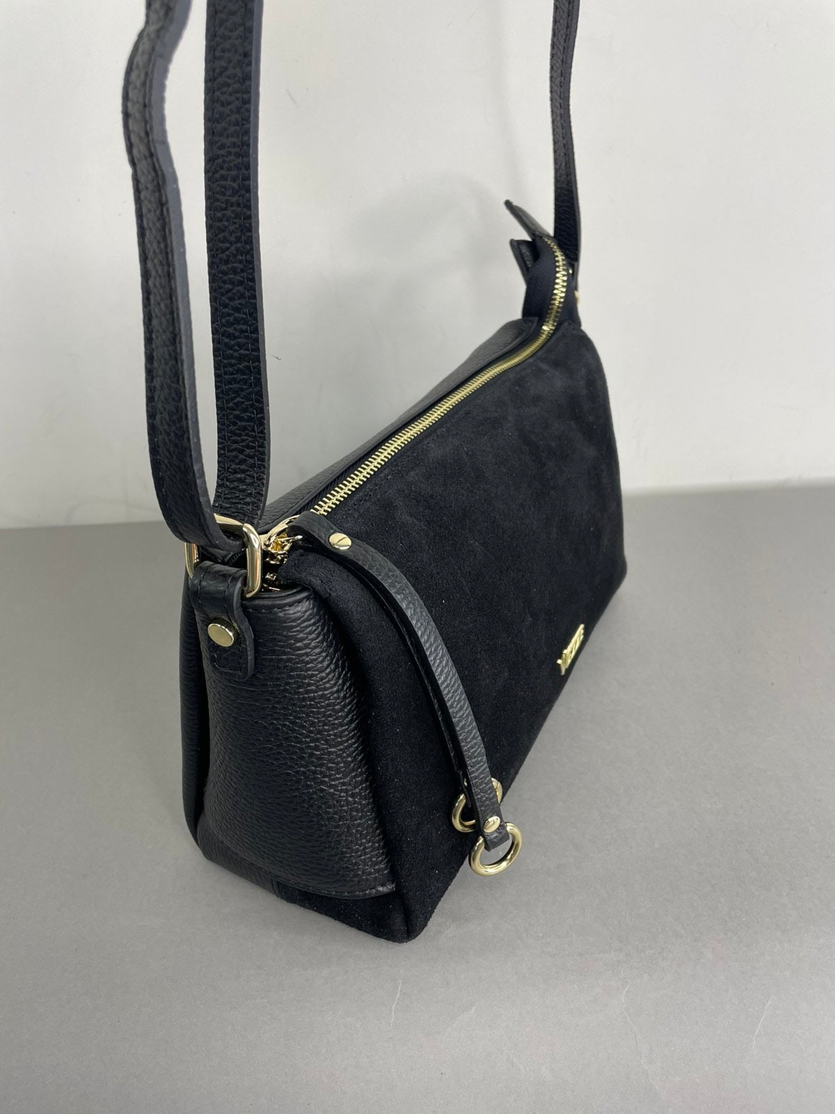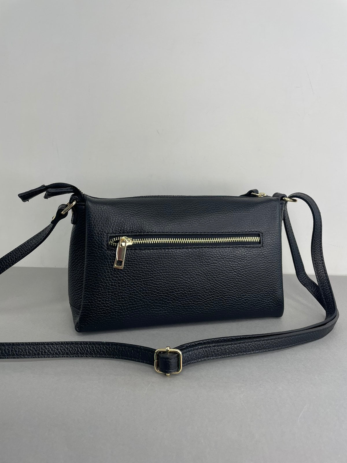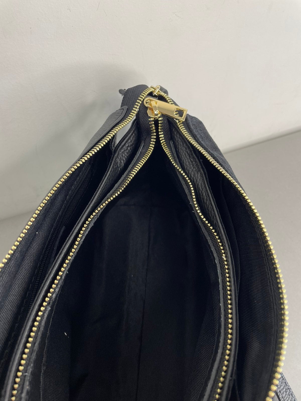 Itališka, Vezze natūralios verstos odos moteriška rankinė per petį. Juodos spalvos raninė, išlaikanti savo formą, viduje turi tris skyrelius. Rankinės priekį puošia nedidelis Vezze ženklelis. Itališkos odinės Vezze rankinės pasižymi aukšta kokybe ir stilingu dizainu.