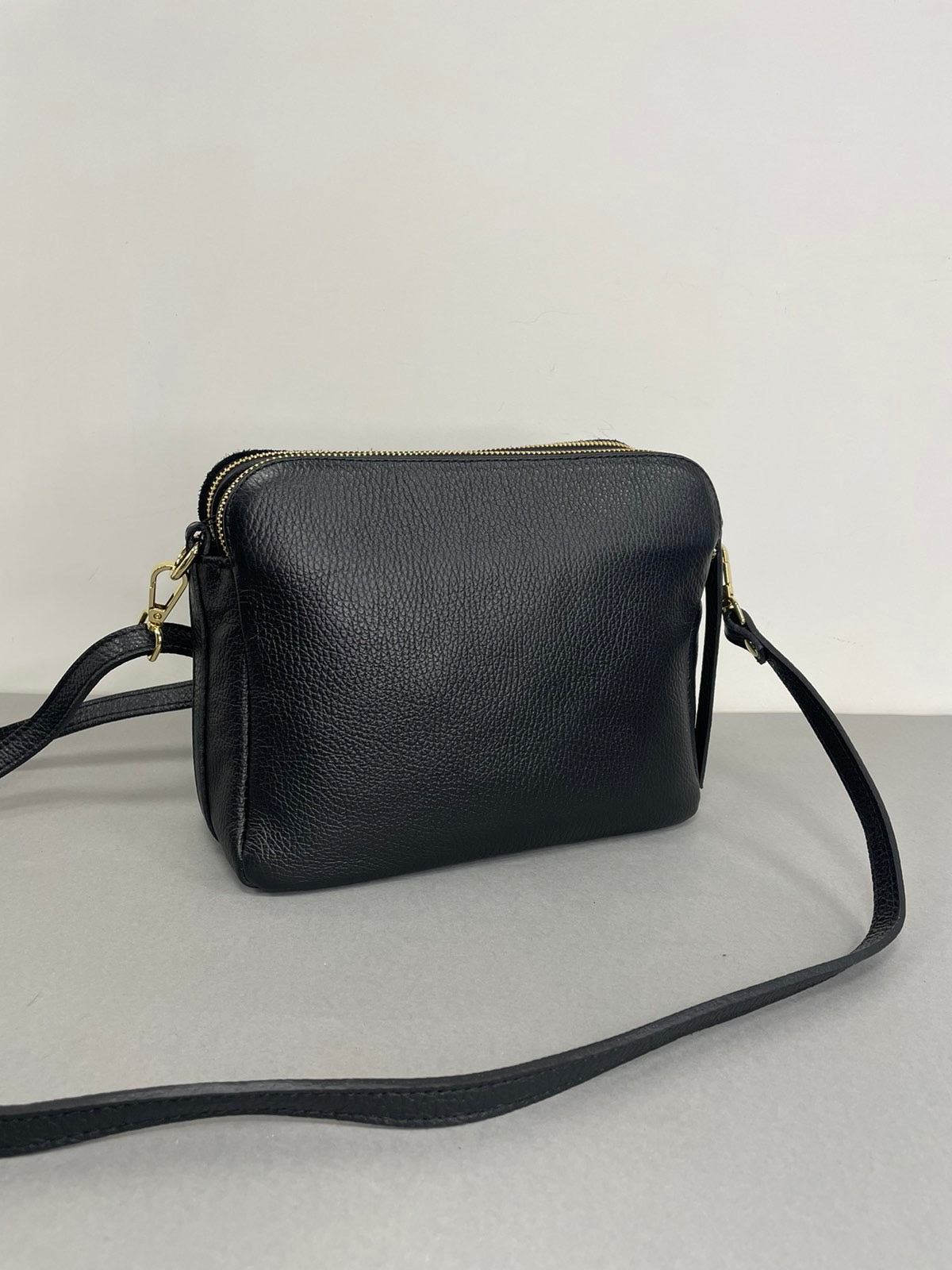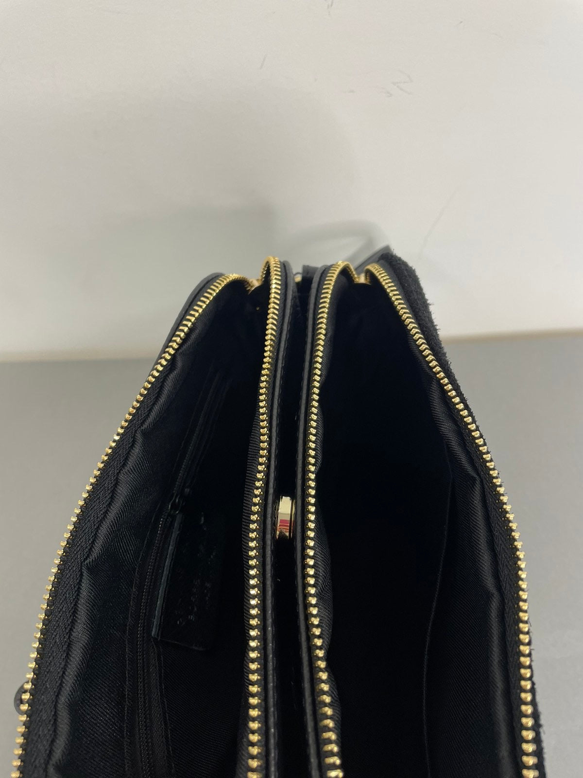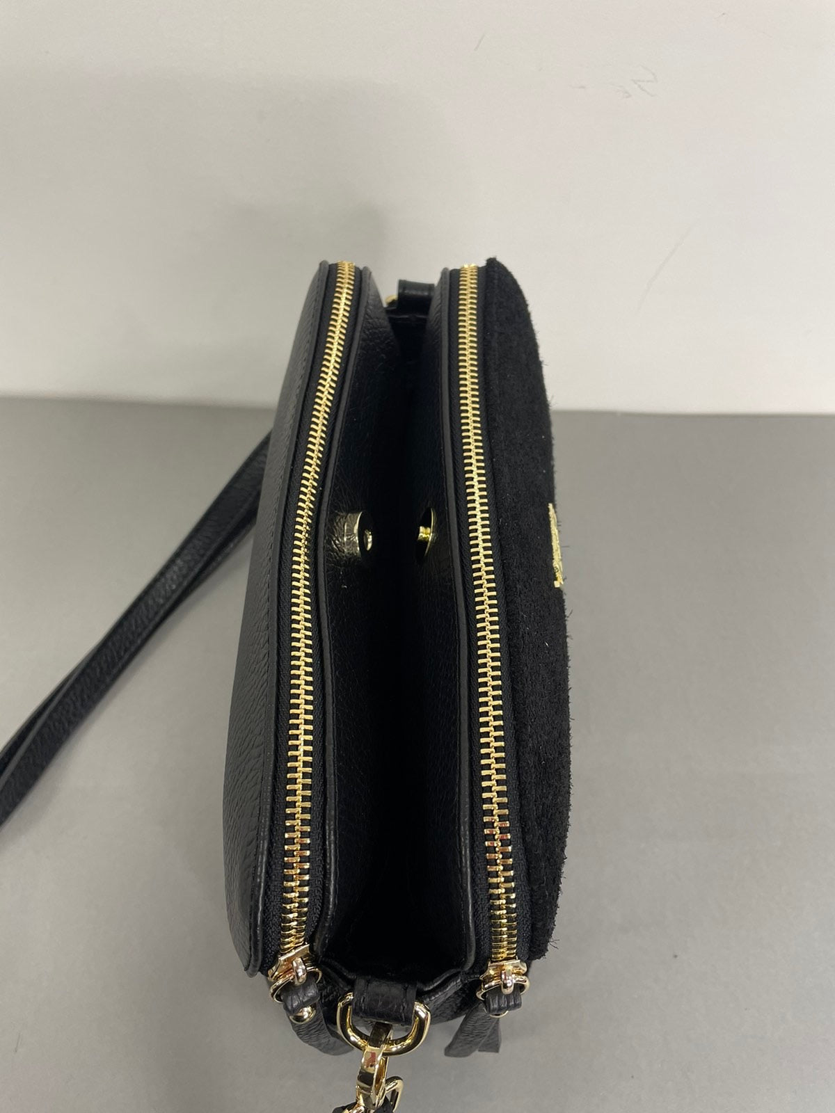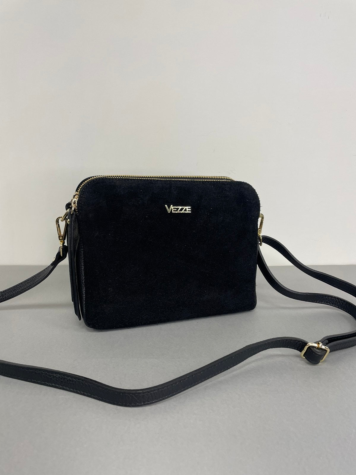 Itališka, Vezze natūralios odos moteriška rankinė per petį su zomšu. Juodos spalvos raninė, išlaikanti savo formą, turi tris skyrelius, iš kurių du užsegami užtrauktuku. Rankinės priekį puošia nedidelis Vezze ženklelis. Itališkos odinės Vezze rankinės pasižymi aukšta kokybe ir stilingu dizainu.